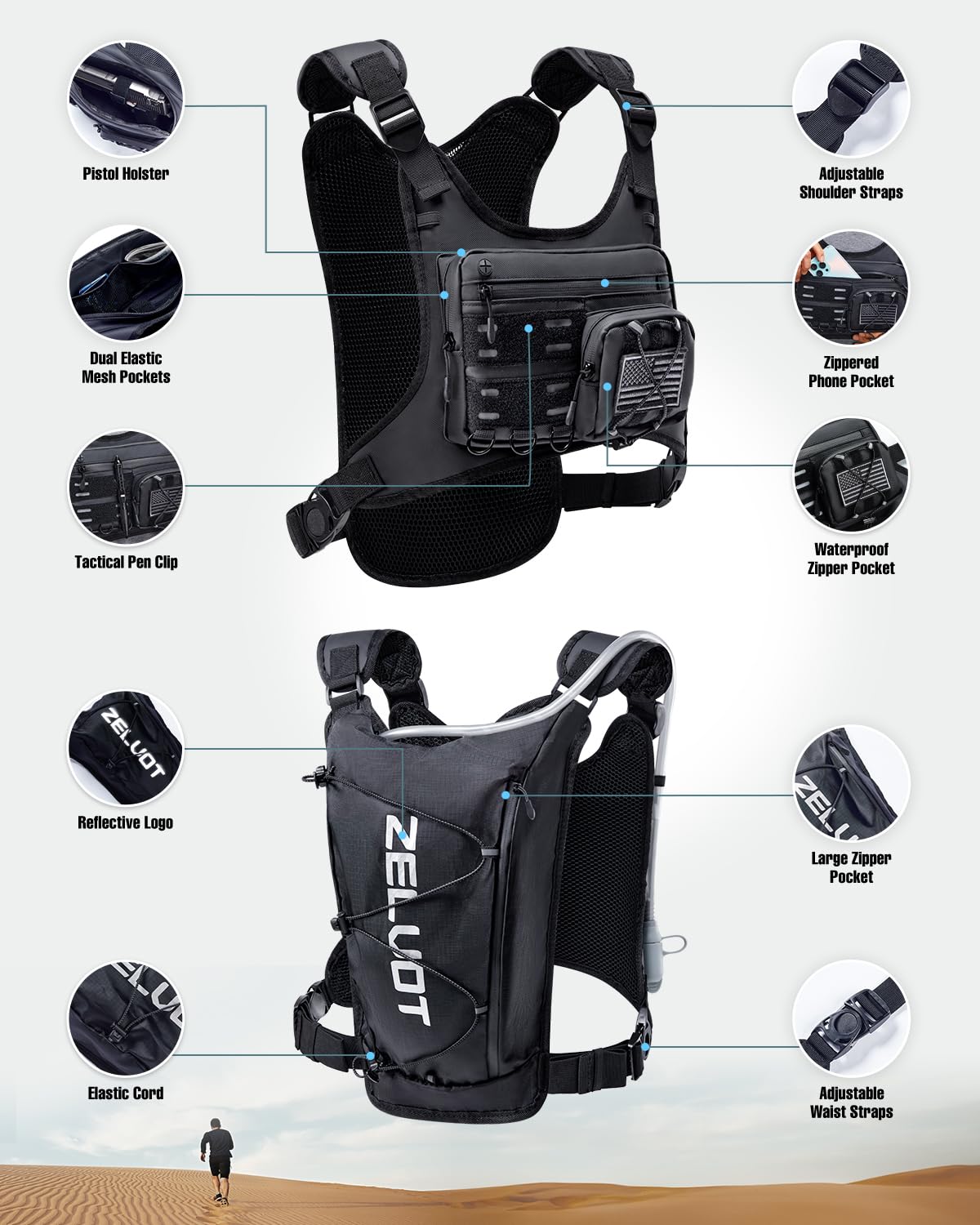 Plenty of Storage - This chest bag features 3 waterproof zippered front pockets to securely hold essentials like your phone, keys, and energy gels. A detachable, bounce-free pistol holster ensures secure storage for small to mid-sized pistols, while the tactical pen slot keeps emergency gadgets within easy reach. Two large back pockets fit a water bladder, towel, extra clothing