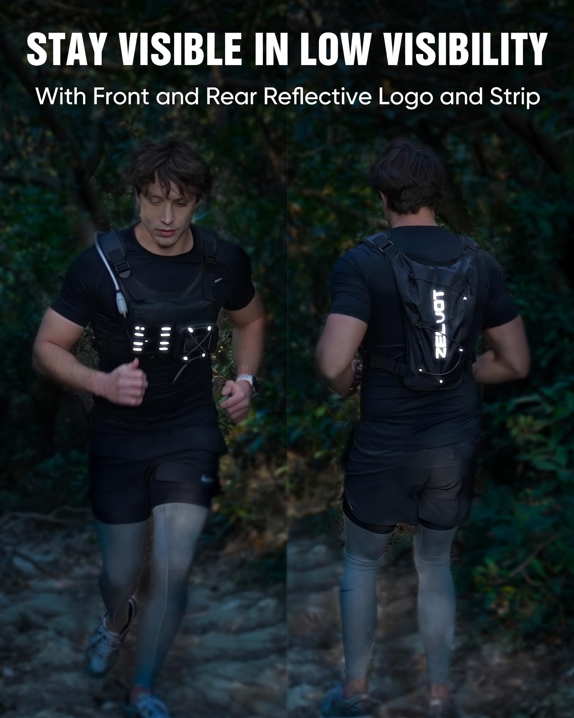Durable & Breathable - The front chest pack is made from waterproof and scratch-resistant 900D Oxford fabric, protecting your essentials from rain and sharp objects. The lightweight and breathable mesh backpack enhances air circulation and moisture-wicking. Reflective logo and strip on the front and back improve low-light visibility. This reflective running vest makes every run farther, safer, and more comfortable