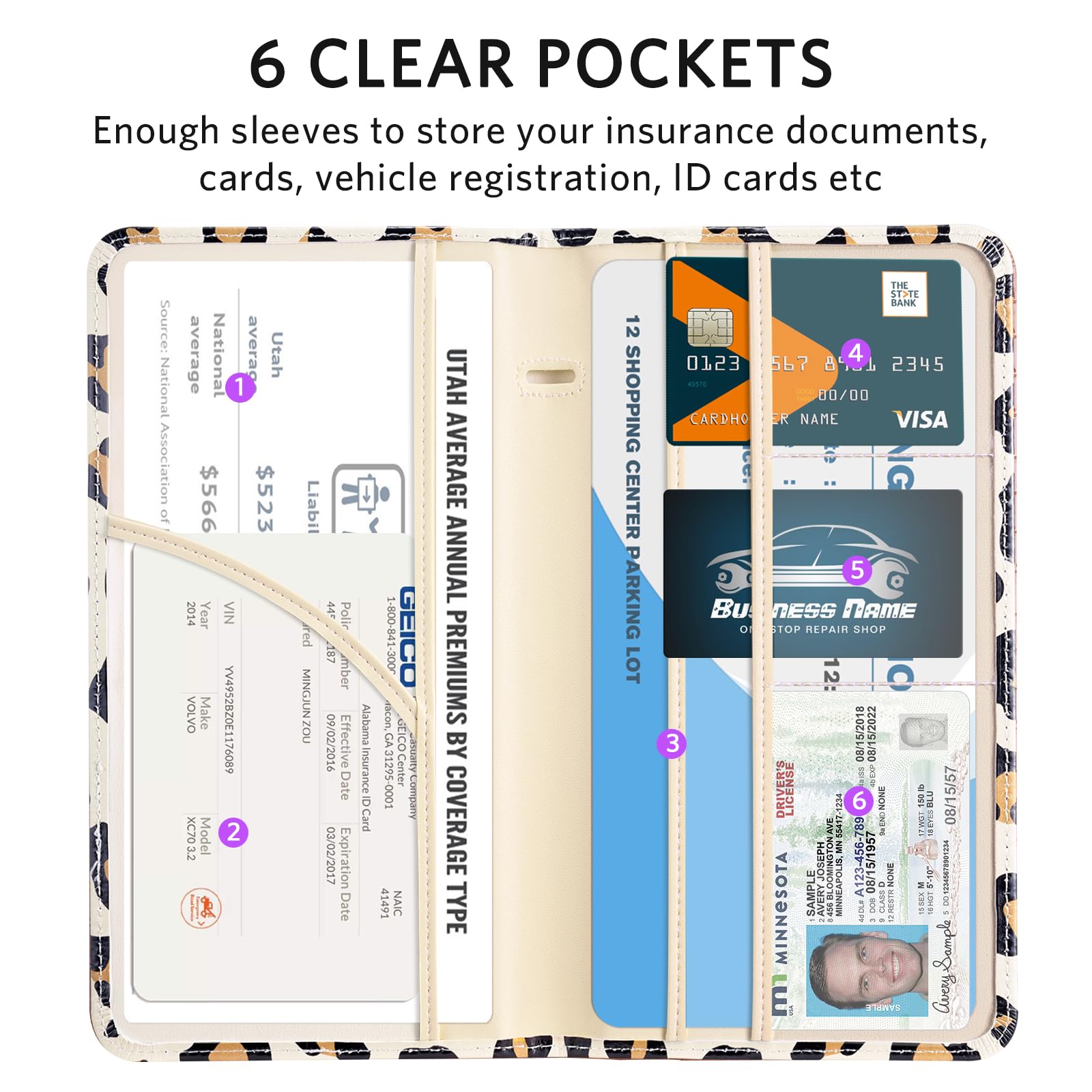 6 Comparments: Comes with 3 large pockets for insurance documents, vehicle registrations cards and other valueable information. And 3 small pocket for driver's license, ID cards, business cards, key contact information cards.