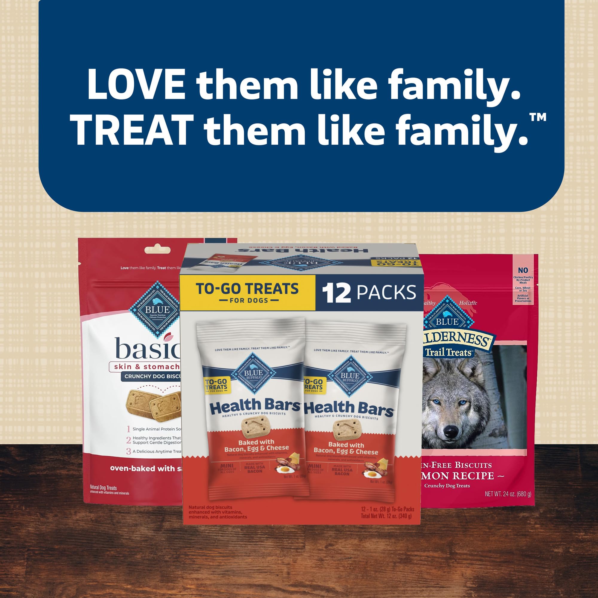 Contains Twelve (12) oz bags of Blue Buffalo Health Bars Natural Crunchy Dog Treats TO-GO, Mini Biscuits, Bacon, Egg & Cheese