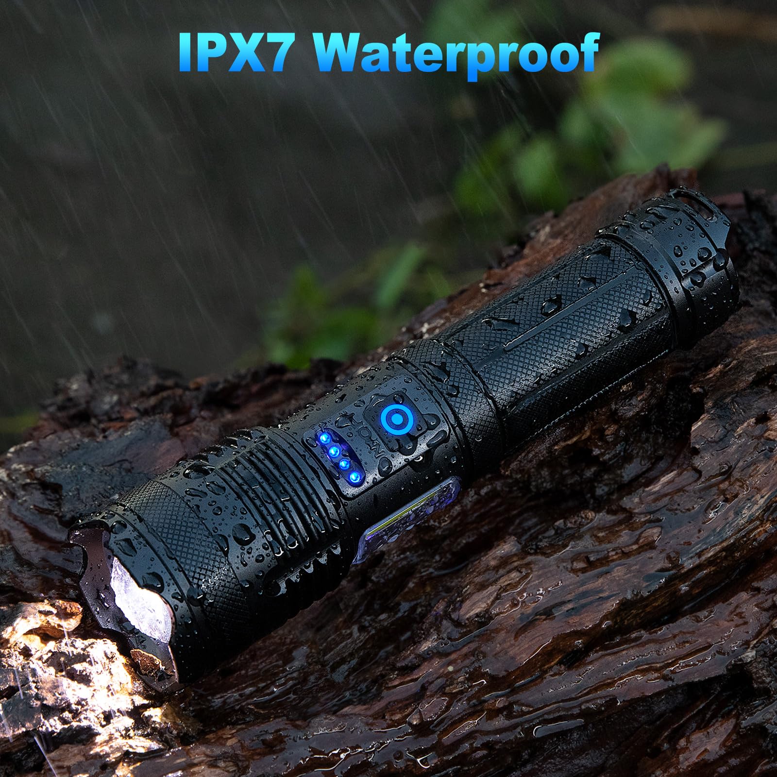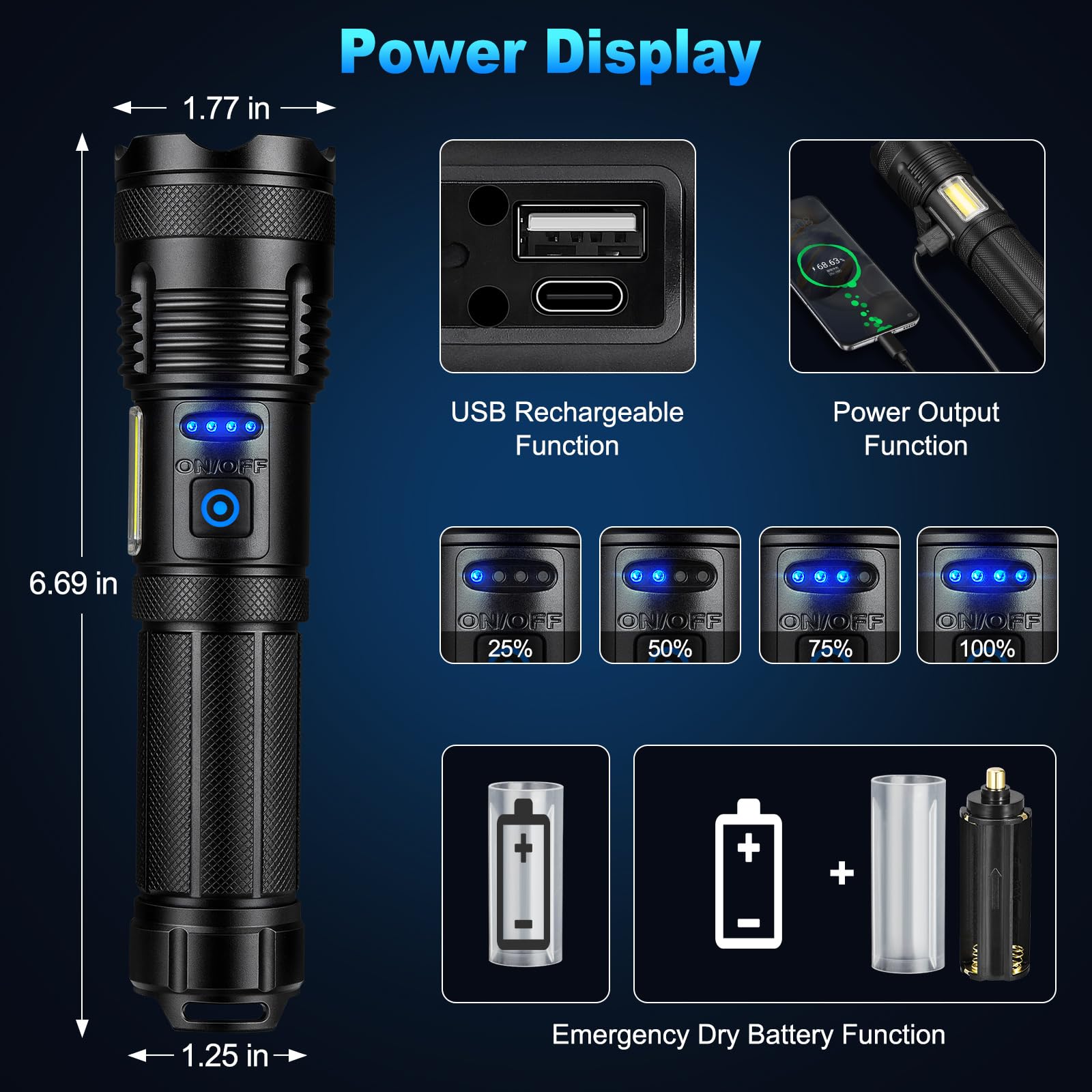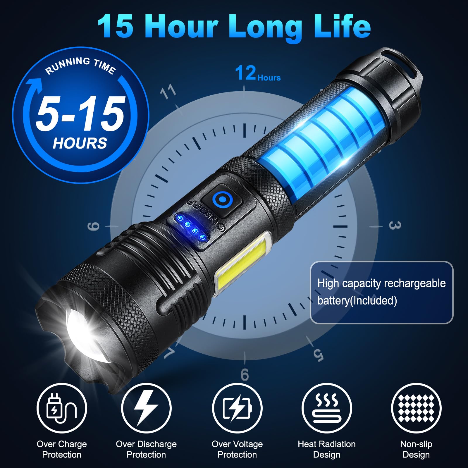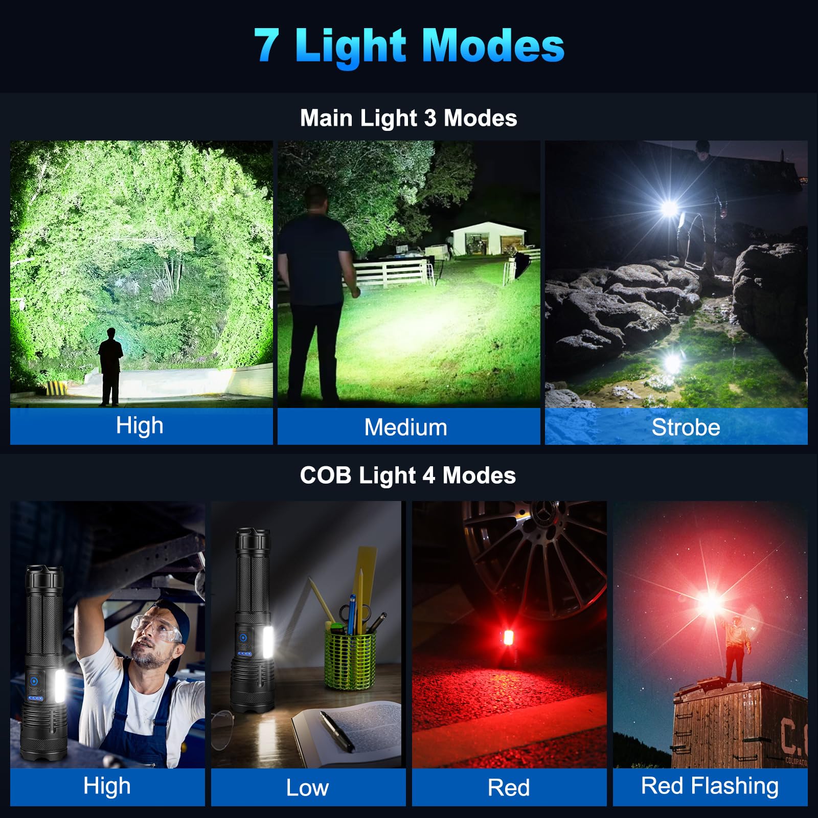 Super Bright 90,000 Lumen - The 2 pack LED flashlights equipped with the latest and brightest chip, the highest output lumens can reach 90,000, which can instantly illuminate 200 square meters of yard