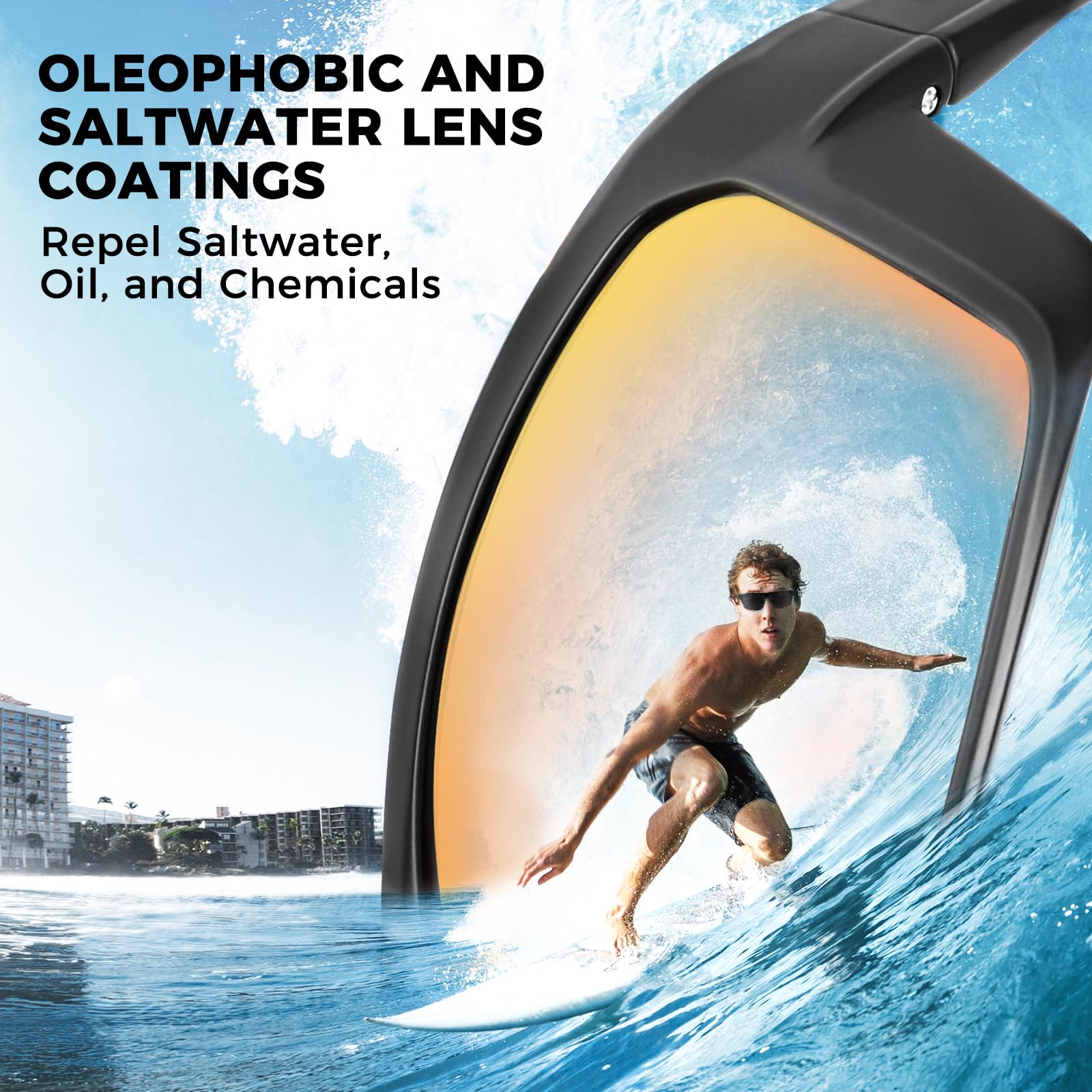 KEY FEATURES – Oleophobic lens coating repels saltwater, oil, and chemicals - Polarized lenses reduce glare - Impact resistant TAC lenses protect your eyes from flying objects - Block 100% of the harmful UVA and UVB rays - Lightweight, durable, and comfortable Grilamid frames.