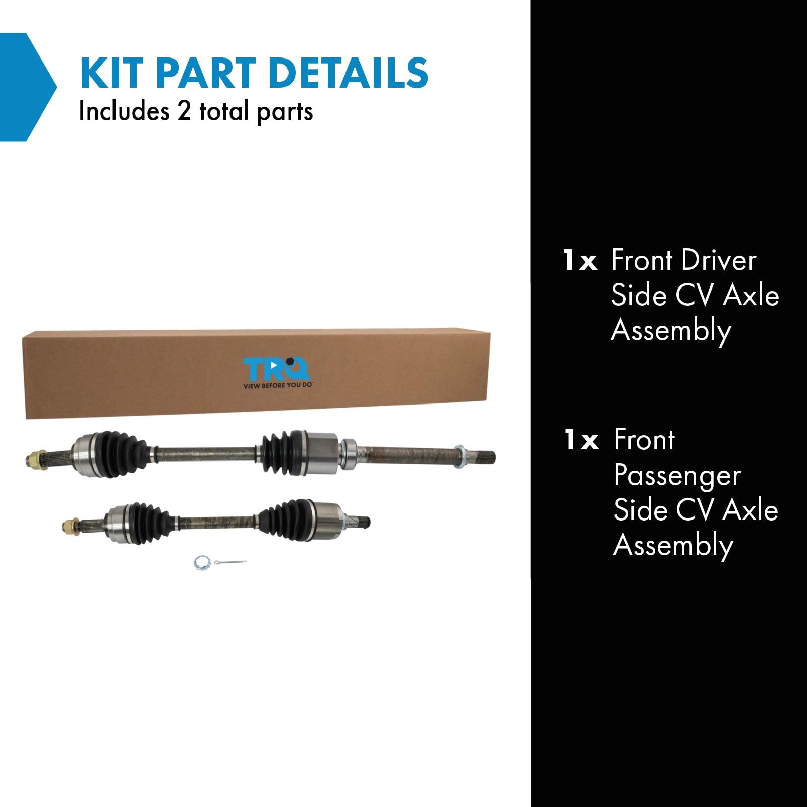 2 Piece CV Axle Assembly Set Kit Includes (1) Front Driver Side CV Axle Assembly (1) Front Passenger Side CV Axle Assembly Fitment Compatible with: 2007-12 Nissan Sentra Base Model Automatic CVT Transmission Front Driver & Passenger Side Compatible with: 2007-12 Nissan Sentra SL Automatic CVT Transmission Front Driver & Passenger Side Compatible with: 2007-12 Nissan Sentra S Automatic CVT Transmission Front Driver & Passenger Side Compatible with: 2009-12 Nissan Sentra SR Automatic CVT Transmission Front Driver & Passenger Side Product Attributes Quantity: 2 Piece Product Features 100% New: Manufactured to tighter tolerances for extended service life Neoprene Boots: Improved durability compared to stock material Moly Greased: Specifically-designed grease shield to reduce premature wear Application Specific Design: No modification Item Details TRQ CV (constant velocity) drive axles are manufactured using premium raw materials designed to restore original performance. TRQ CV drive axles are new, so there is no core charge with your TRQ purchase. TRQ-designed drive axles utilize neoprene boots, moly grease, stainless steel clamps, and heat-treated ball tracks to ensure extended service life. Each TRQ axle is application-specific so each spline and thread will mate properly for a seamless fit. All products are fit and road-tested in our Massachusetts R&D facility to ensure we deliver on our promise of Trusted Reliable Quality. Reference Numbers 39100ET200 39101ET200 447-50401R 447-50404L 66-6258 66-6259 666258 666259 ADS00108 ADS00109 NCV53918 NCV53919 NI8222 NI8223