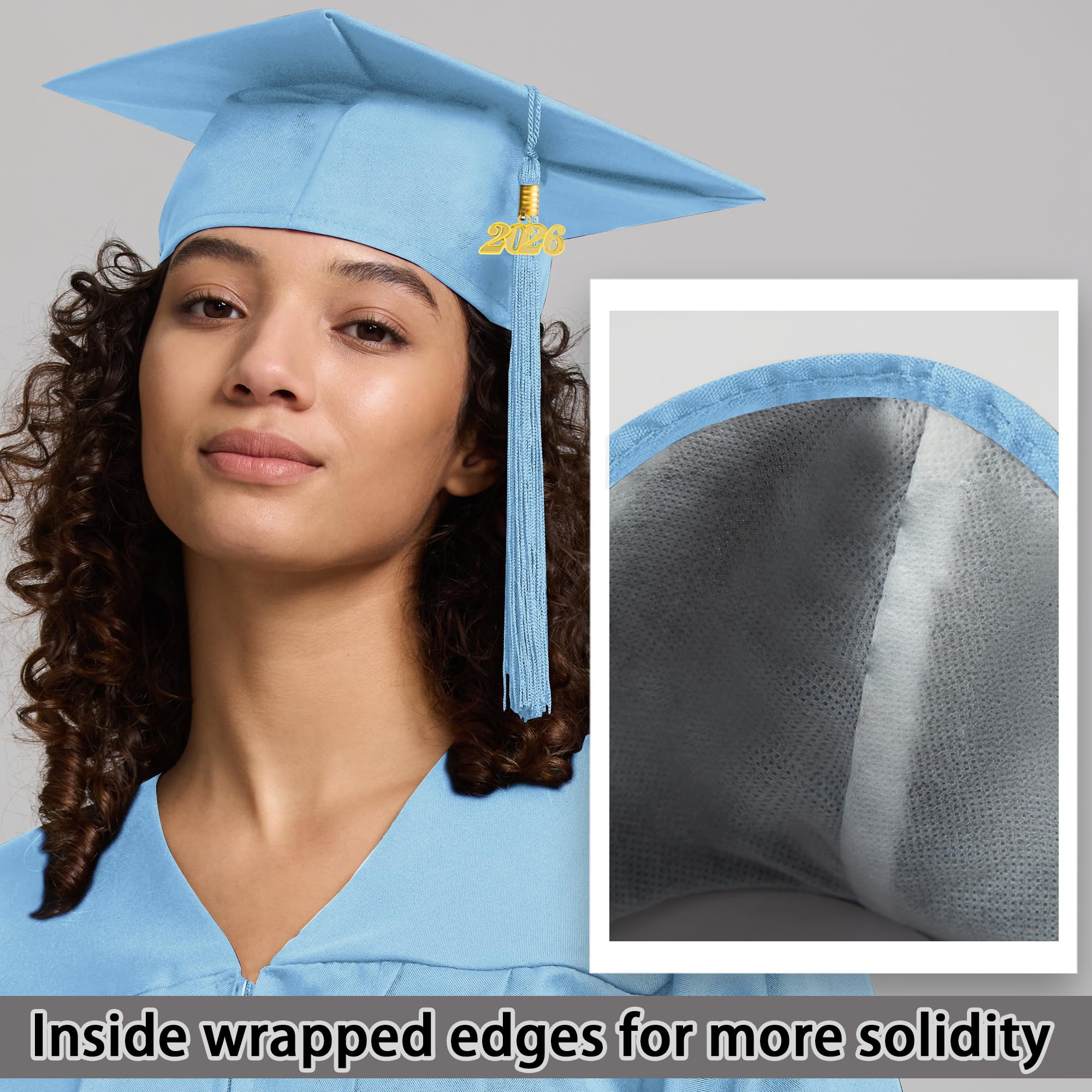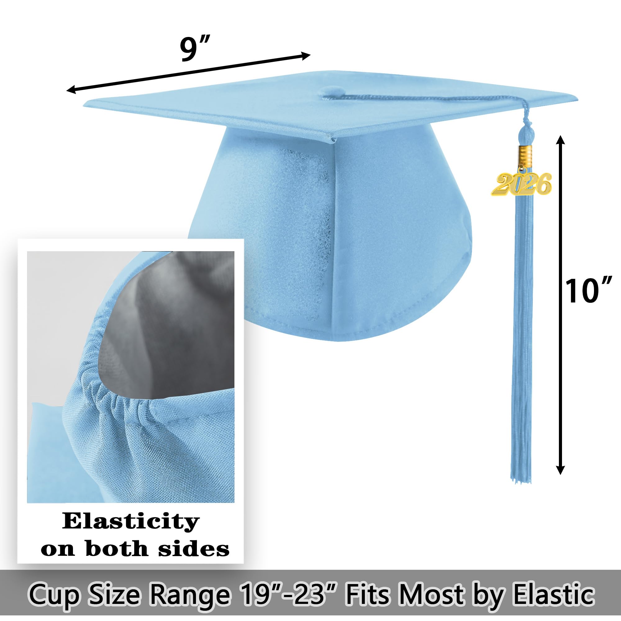 PRODUCT SPECIFICATIONS,PREMIUM MATERIAL:This graduation cap features a classic 9x9 inches hardboard top covered in high-quality matte polyester. It comes with a 9-inch long tassel and a detachable 2026 year charm. The elegant matte finish ensures you look professional and polished on your big day.