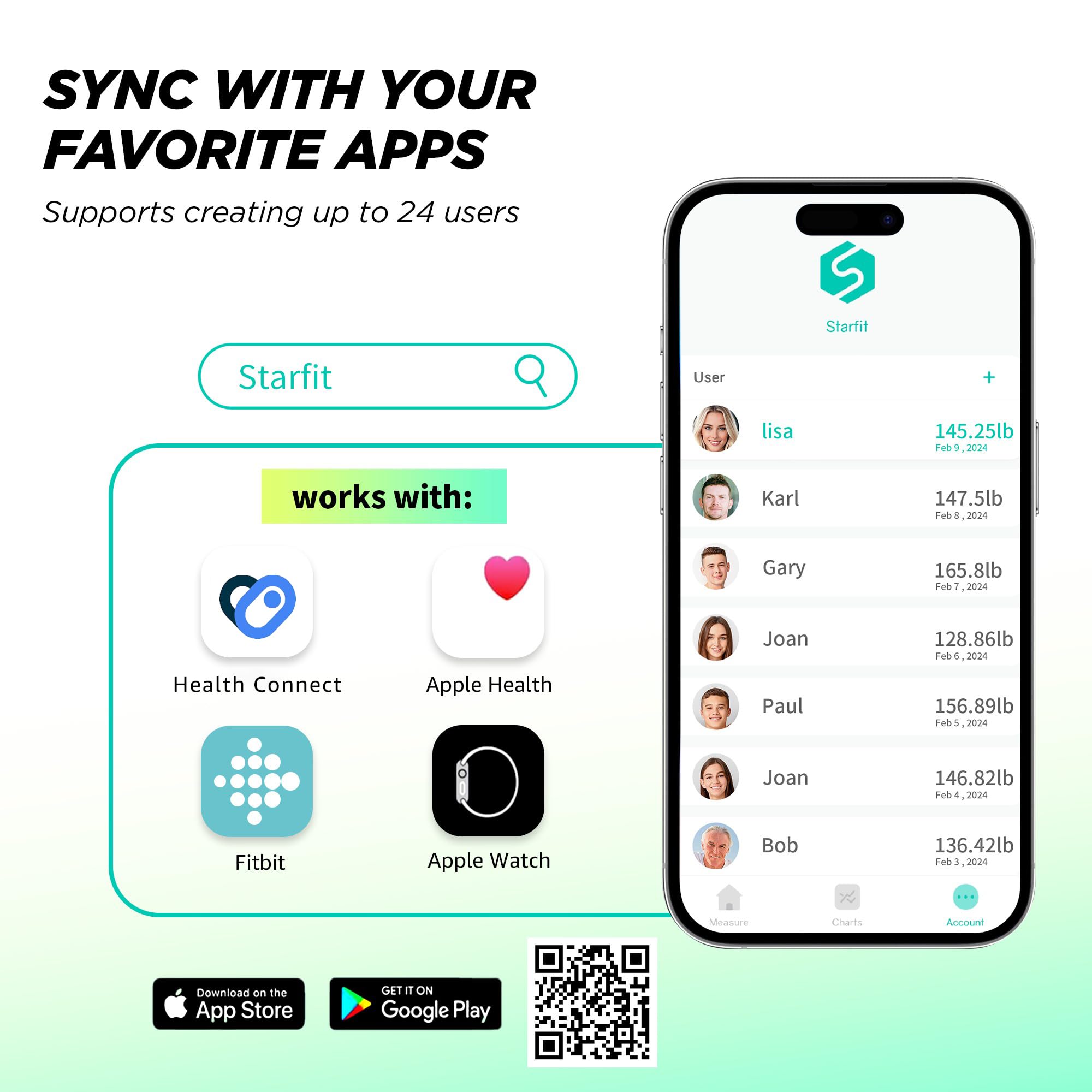 One Scale Unlimited Users: Starfit App allows you to create unlimited profiles 24 Users for your family and friends with only one smart scale. Starfit App also can easily sync with other fitness Apps like Apple Health, Health connect , Fitbit and so on.