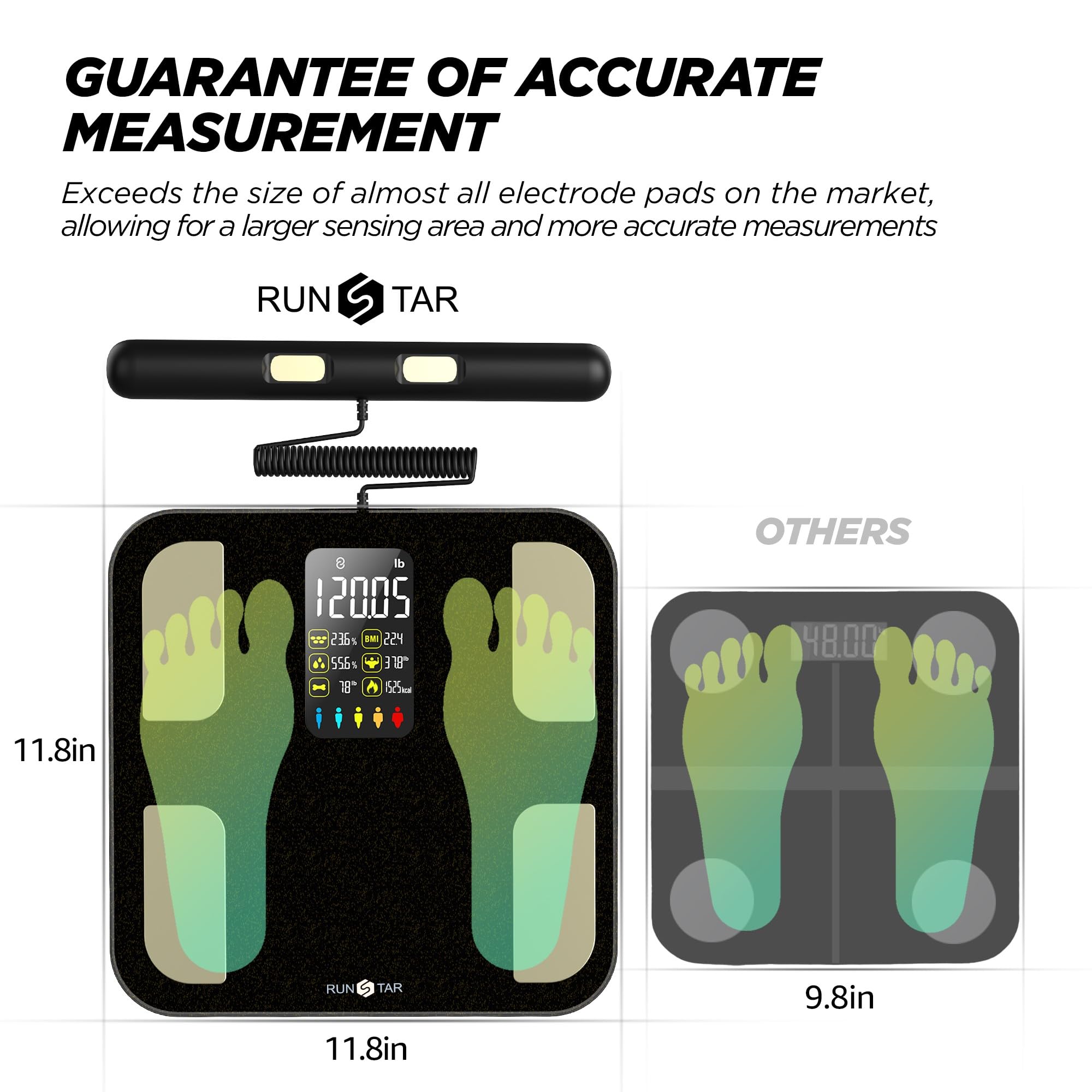 20 Essential Measurements: Runstar smart scale shows not only weight but also BMI, body fat, subcutaneous fat, body water, protein, BMR, bone mass, body age etc., by electrical Bio-Impedance Measurement Technology.