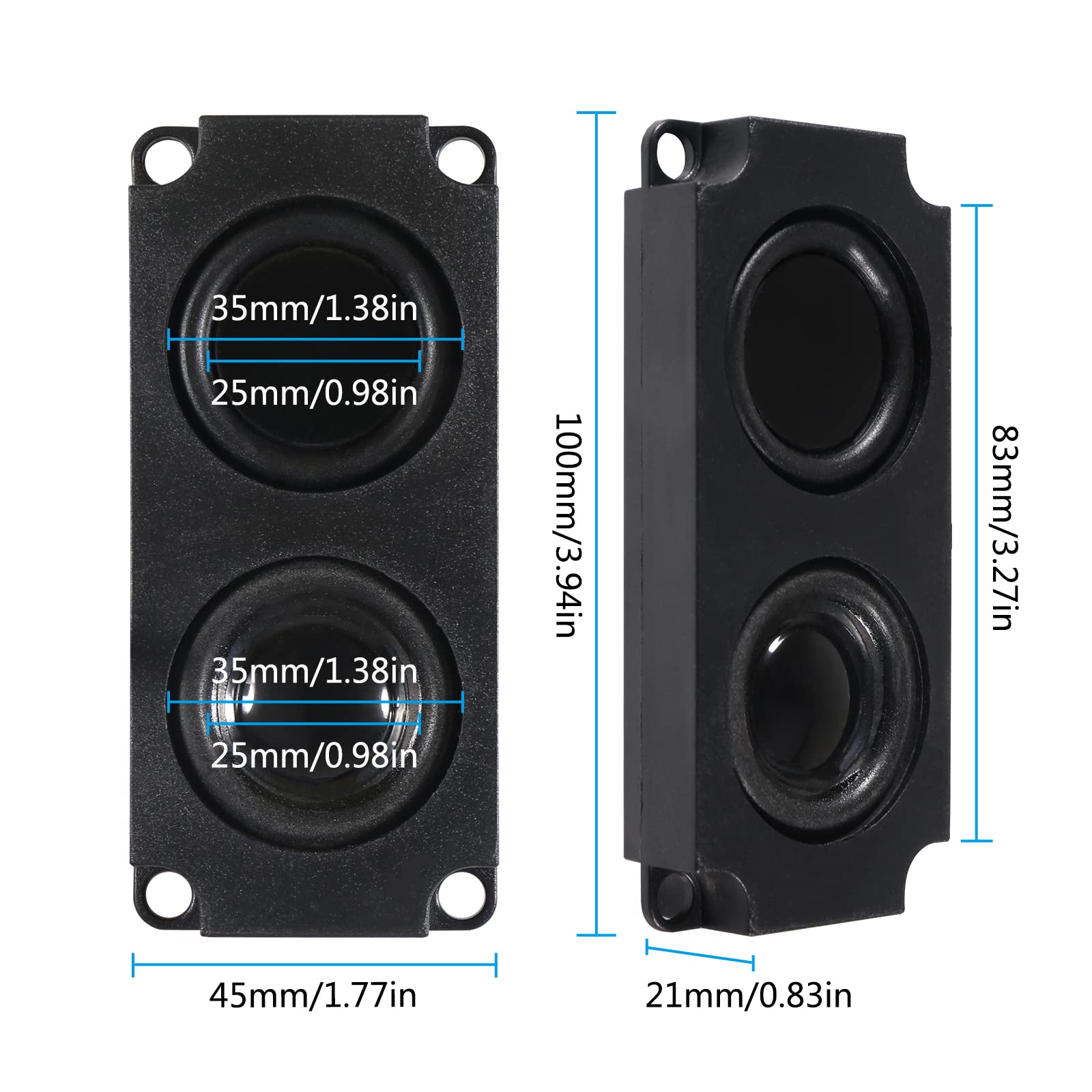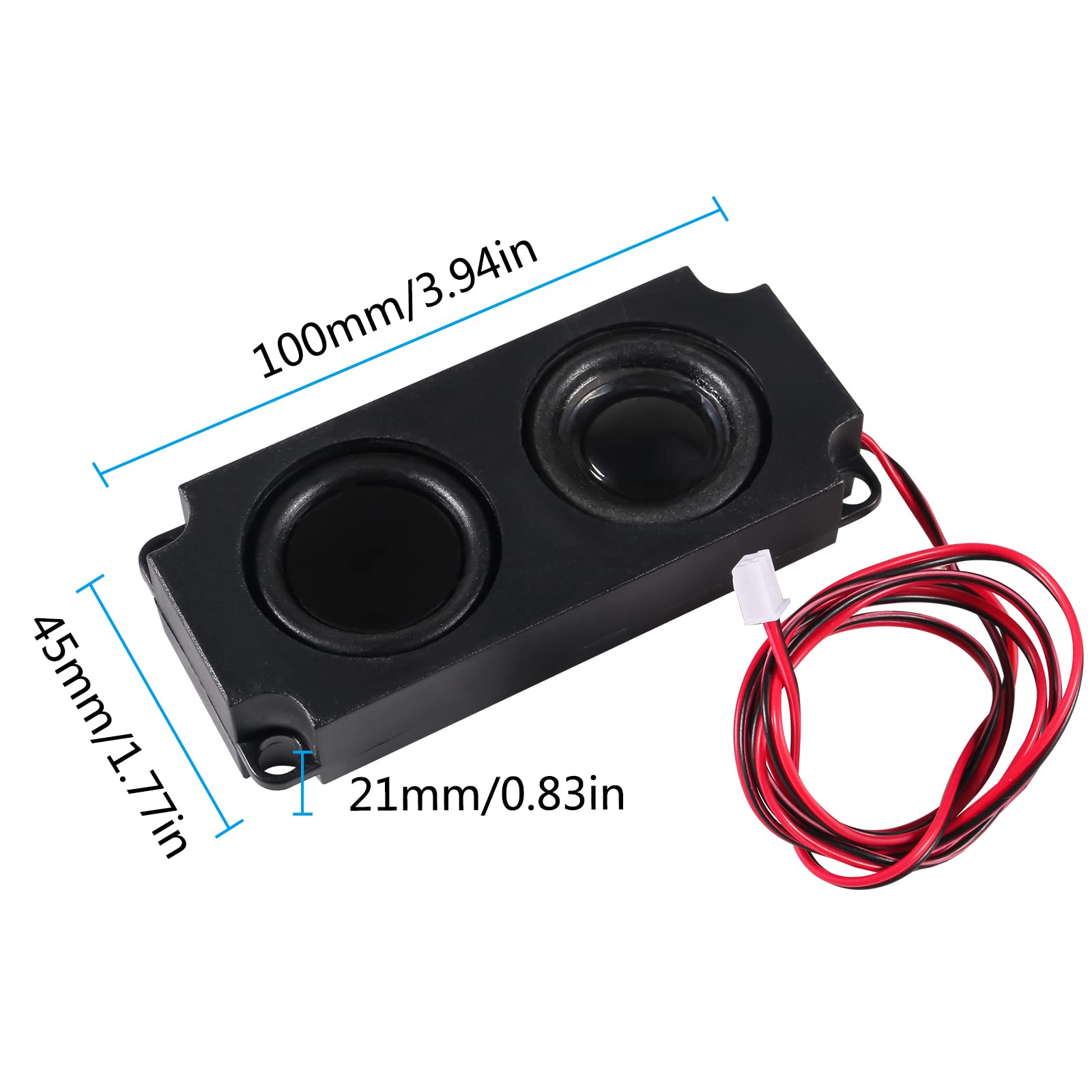 Features: Portable Speakers 10045 LED TV Speaker 8 Ohm 5W Double Diaphragm Bass Computer Speaker DIY for Home Theater; Specifications: Material:ABS Color:Black Speaker with 4p cable plug Built-in Speaker: 40mm dual magnet Size:Approx.10x4.5cm/3.94x1.77in Pitch: Length: 92MM/3.62in, Width: 36MM/1.42in Impedance: 8 ohms Power: 5W Note: please check the product parameters to determine whether the product is suitable for your device. If you have any questions, please contact us. Package Includes: 2 x Speakers