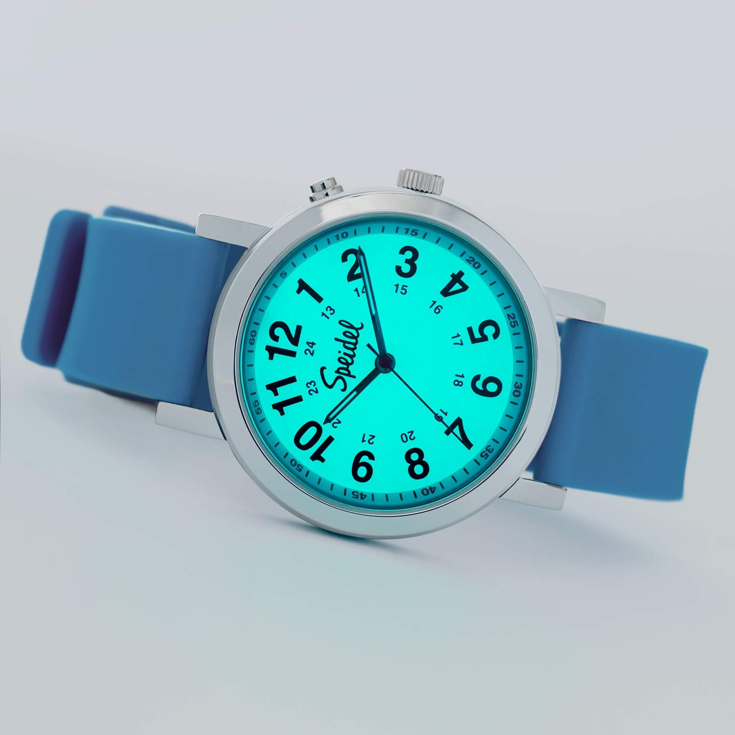 Description Taking Medical Professionals From Day To Night Well-loved by doctors, nurses, assistants, students, and beyond, the Scrub Glow Watch was crafted specifically to fit the needs of medical professionals. With a push of a button, the dial lights up on command. It is the perfect watch to take you from day to night (shift). [split] Easy-to-read:Displaying a crisp white face with 12 and 24-hour markers, the Scrub Glow Watch features a 3-hand quartz movement with a highly-visible red second hand. This allows for complete accuracy when performing pulse readings. Easy on the eyes:The electroluminescent dial lights up with the push of a button. There is no need to strain your eyes in darker settings. Easy to clean:Holds up to the unlimited number of hand washes between patients with a comfortable, water-resistant silicone band. Easy to adjust:Keep comfortable with its easy-to-adjust strap, fitting a wide range of wrist sizes, from 5” (127 mm) to 7.48” (189.9mm). Â