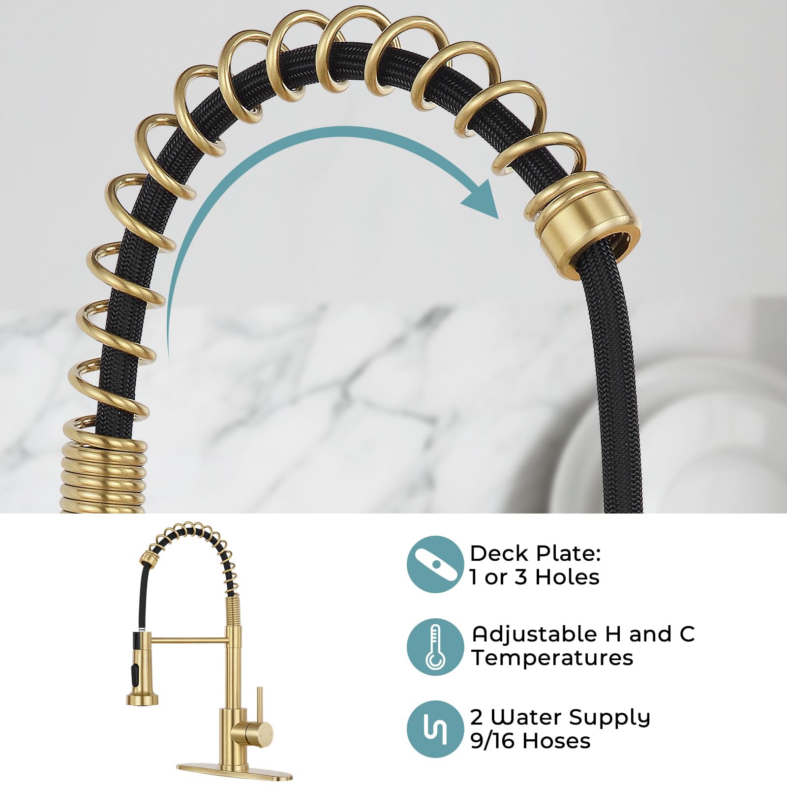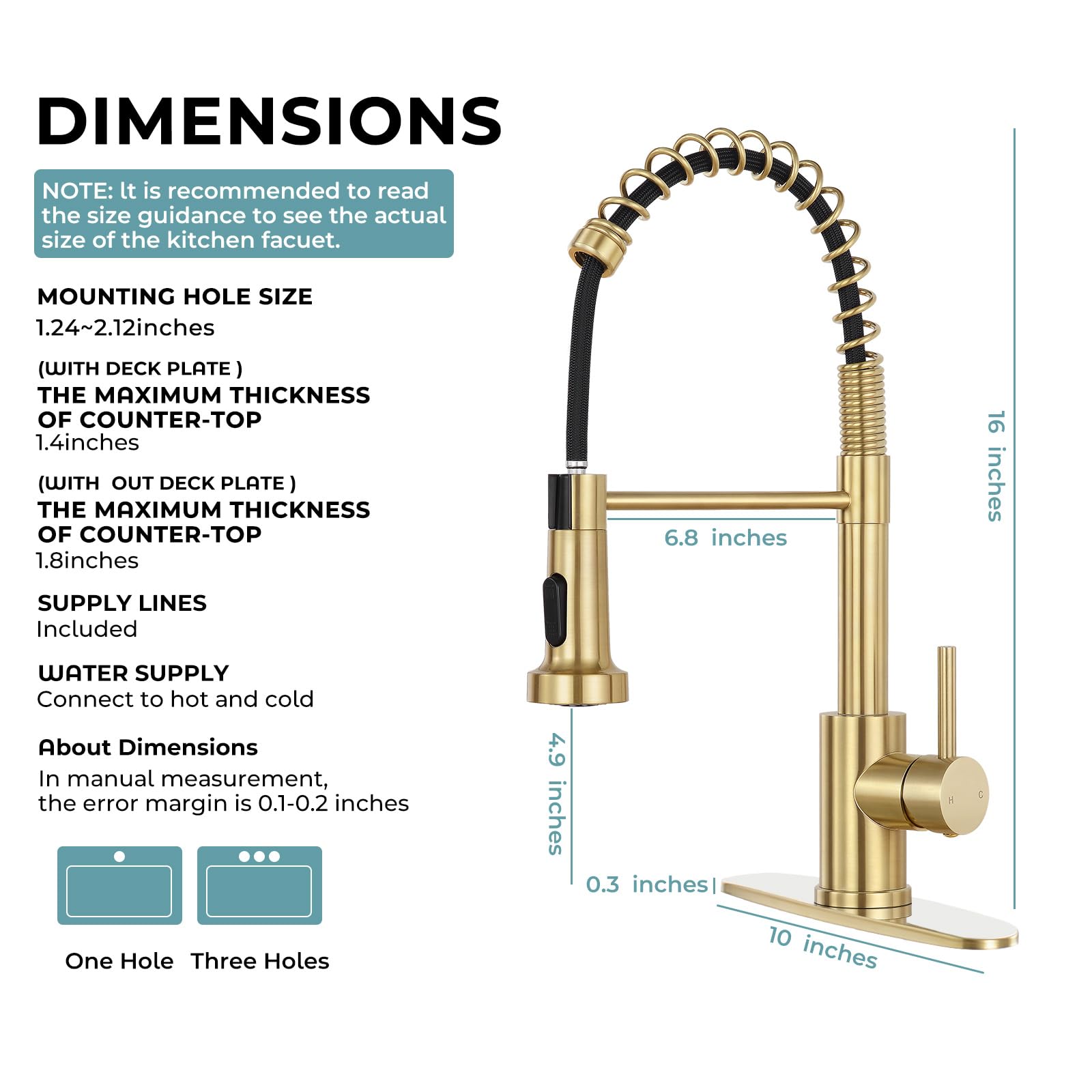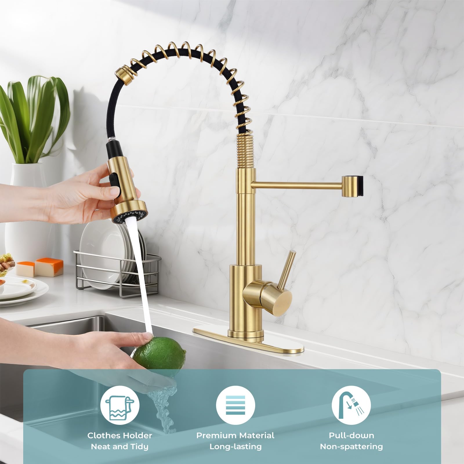 Durable Construction: Premium multiple layer brushed gold coated kitchen faucet resists rust, corrosion, and tarnish. Brushed finish resists fingerprints and water spots for a cleaner looking Kitchen