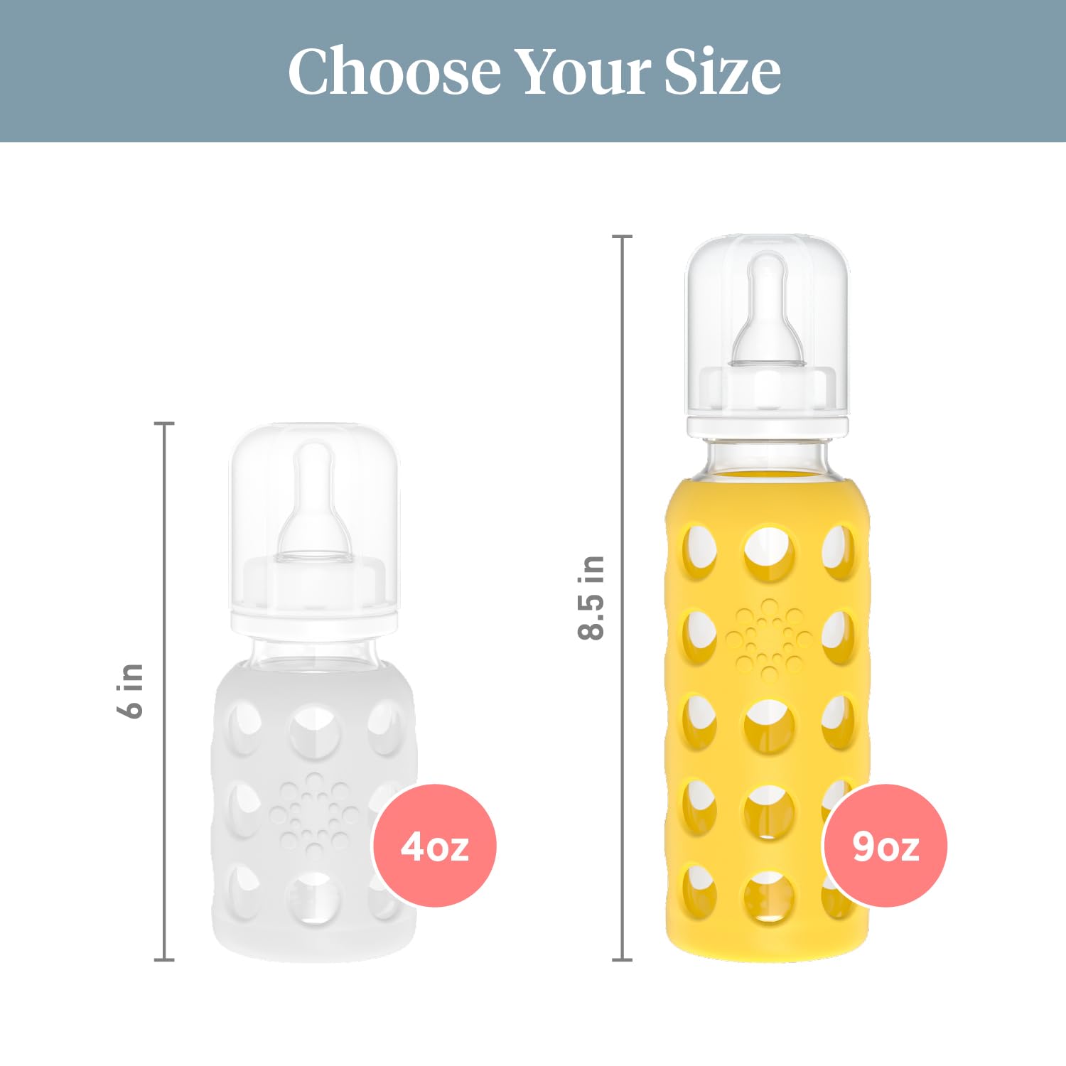 Our baby bottles are made of the highest quality, thermal shock resistant borosilicate glass. This allows our bottles to transition safely from freezer to boiling water. The silicone sleeves provide a good gripping surface for little hands and help protect against the occasional drop. Includes 9-ounce (250 ml) bottle with Stage 2 (3-6 mos) nipple. Care and use - Before first use, place in dishwasher or in boiling water for 3 minutes. This is to ensure hygiene. Immediately after use, disassemble individual top components (e.g. nipple from top or valve from cap). All parts are dishwasher safe (top rack only). To wash by hand: wash separately in hot, soapy water and rinse thoroughly. Bottle and sleeve may be placed in the dishwasher or boiled without removal of the sleeve. If you wish to remove the sleeve, it comes off best in warm, soapy water. To allow venting and prevent nipple/valve collapse, do not over-tighten screw top