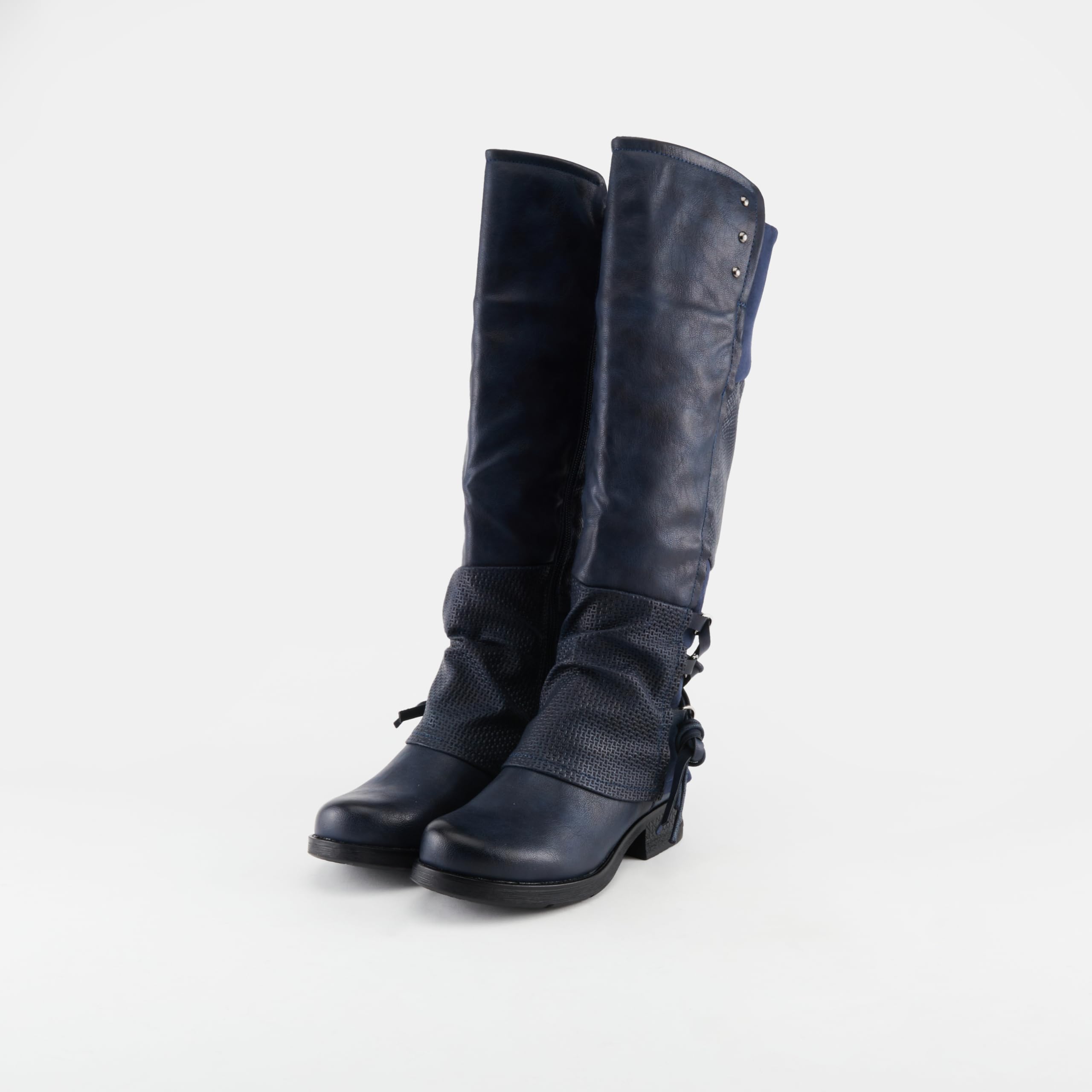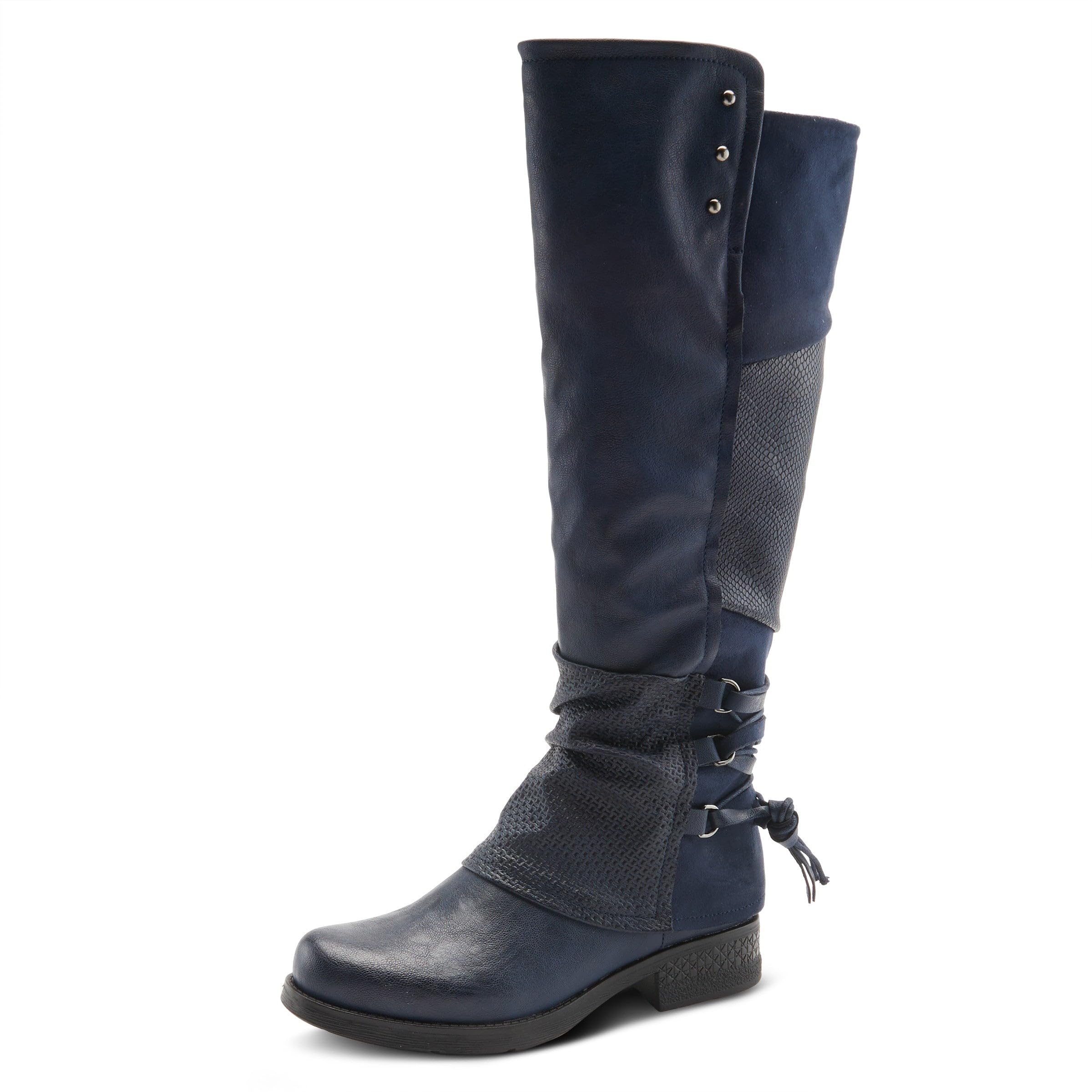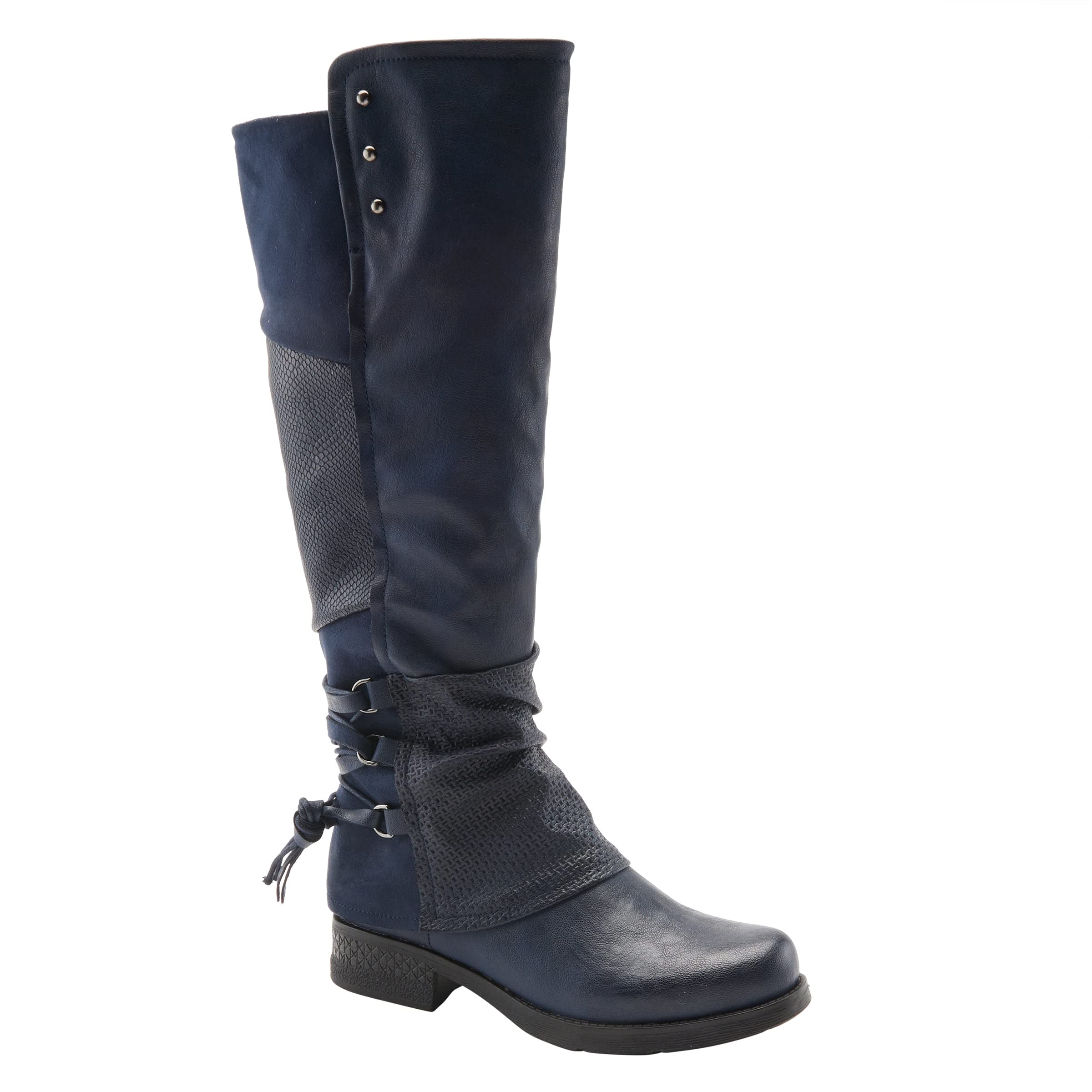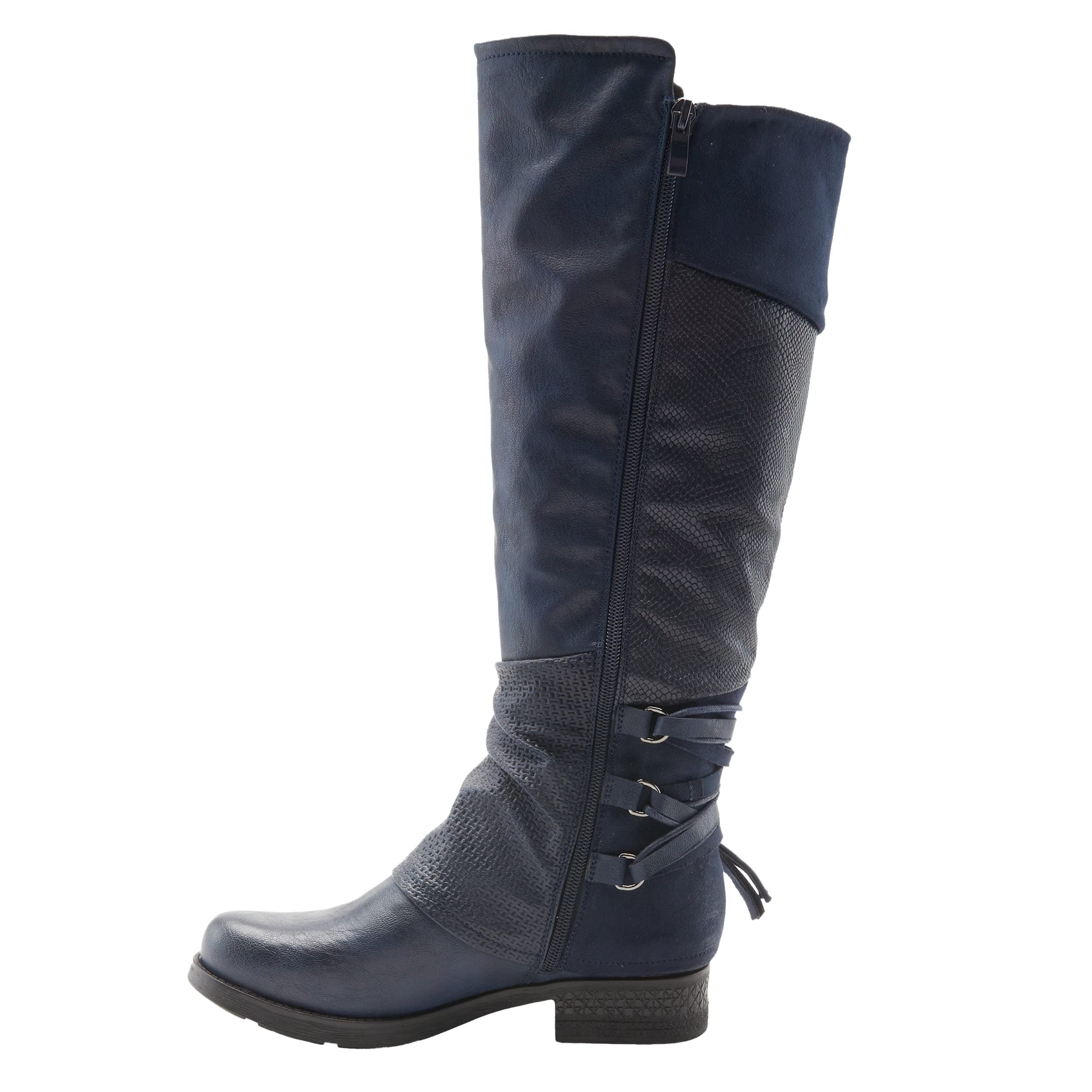 Embossed Patchwork Design: These women's boots showcase an eye-catching soft embossed patchwork design make this knee-high boot a true piece of art. The addition of a decorative back and round-toe silhouette make these sculpted-heel boots a season must-have.