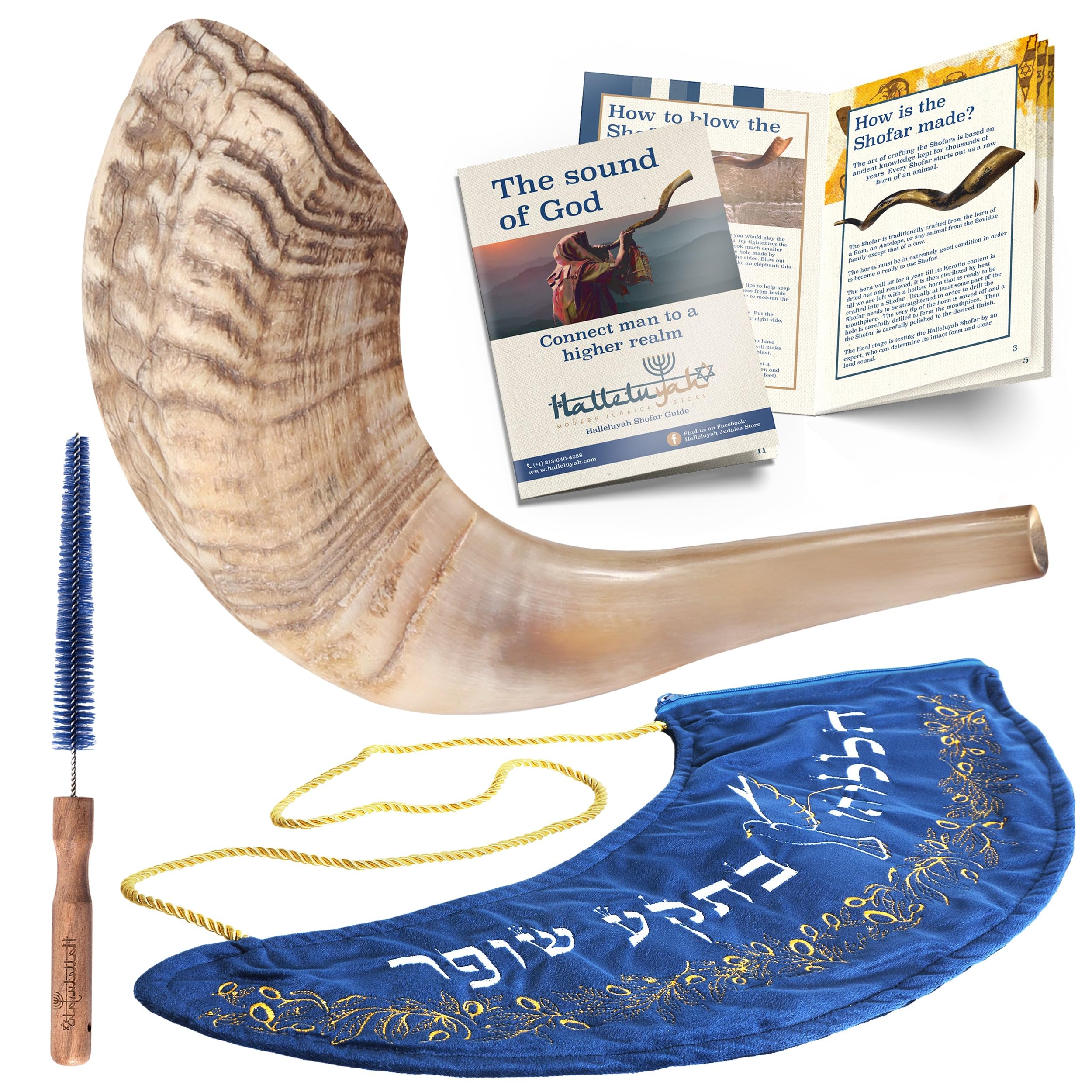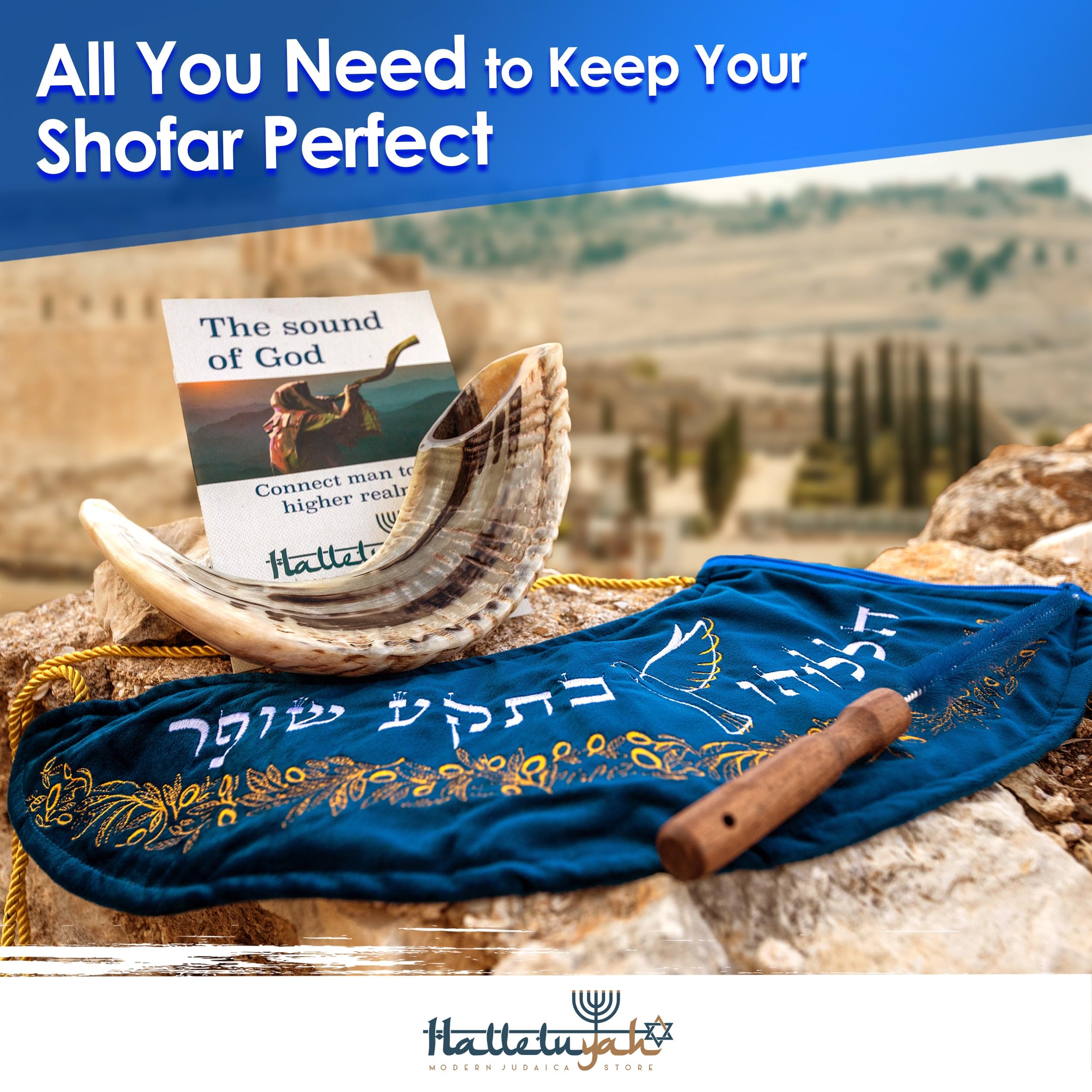 Complete Set, Thoughtfully Curated: This set includes a handcrafted ram horn shofar, a detailed blowing guide to master its use, a custom cleaning brush for care, and a velvet bag for convenient transport. Each accessory is designed to honor and enhance the experience of this sacred instrument.