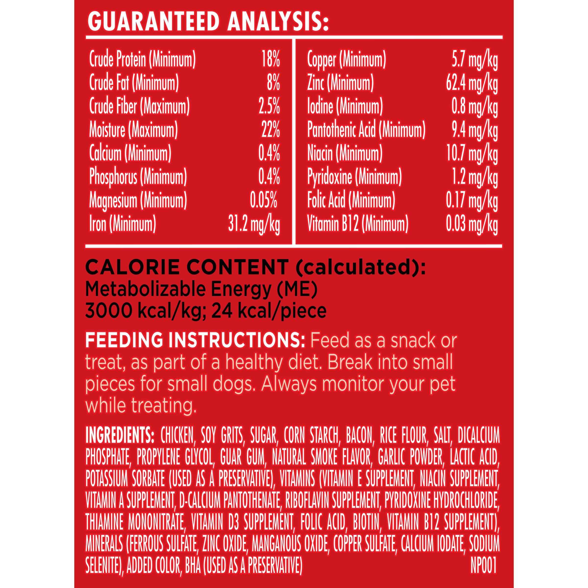Chicken: Add more wholesome goodness to your dog’s day with Milk-Bone Soft & Chewy Chicken Recipe With Chicken Breast dog treats. These delicious, tender dog snacks are made with real chicken and fortified with vitamins and minerals—12 to be exact! On top of their irresistibly savory taste, the soft texture of these treats makes them easy for dogs of all sizes to enjoy, whether you feed them whole or break into smaller pieces. And with a 100+ year history of baking our treats with love and high-quality ingredients, you can feel good about filling doglife with a little extra joy. Bacon: Unleash pure dog joy with mouthwatering taste and texture from a brand you trust: Bust out Milk-Bone Soft & Chewy dog treats made with real bacon. These tender, tempting treats are easy to chew and hard not to love — and not just because they′re full of that savory bacon flavor. They′re also rich in protein, colored by natural ingredients, fortified with 12 vitamins and minerals, and baked with love in Buffalo, New York, USA. In other words, they′re wholesome and tasty dog snacks that you can feel good about giving (and your dog will be thrilled to get). Order now to let your dog in on the fun.