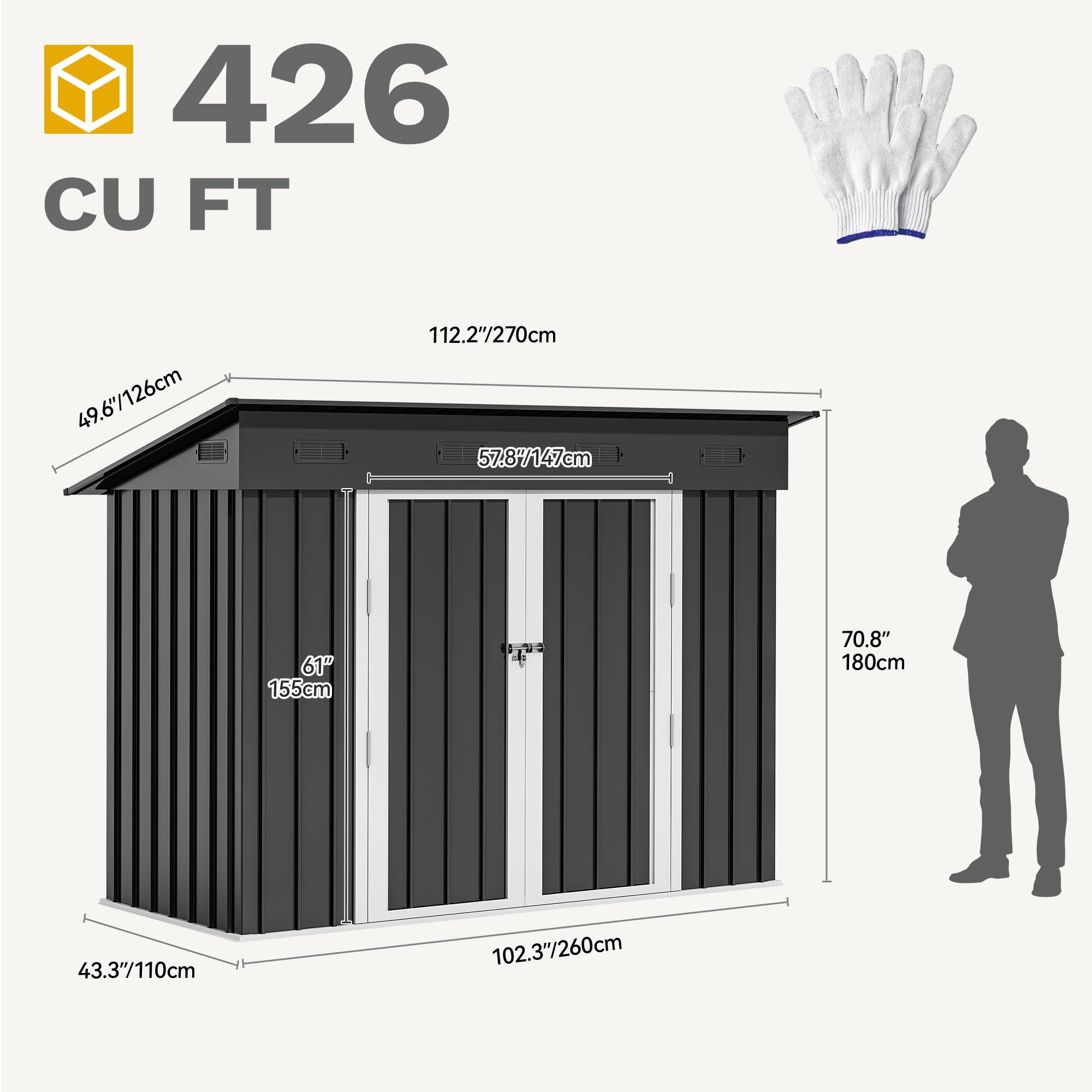 Spacious Organizer: Featuring outer dimensions of 112.21''L*49.6''W*70.8''H and door size of 57.8''L*61''W, this garden storage shed provides ample space for snow blowers, lawn mowers, outdoor chairs, bikes, BBQ grills, generators, garbage bins, etc