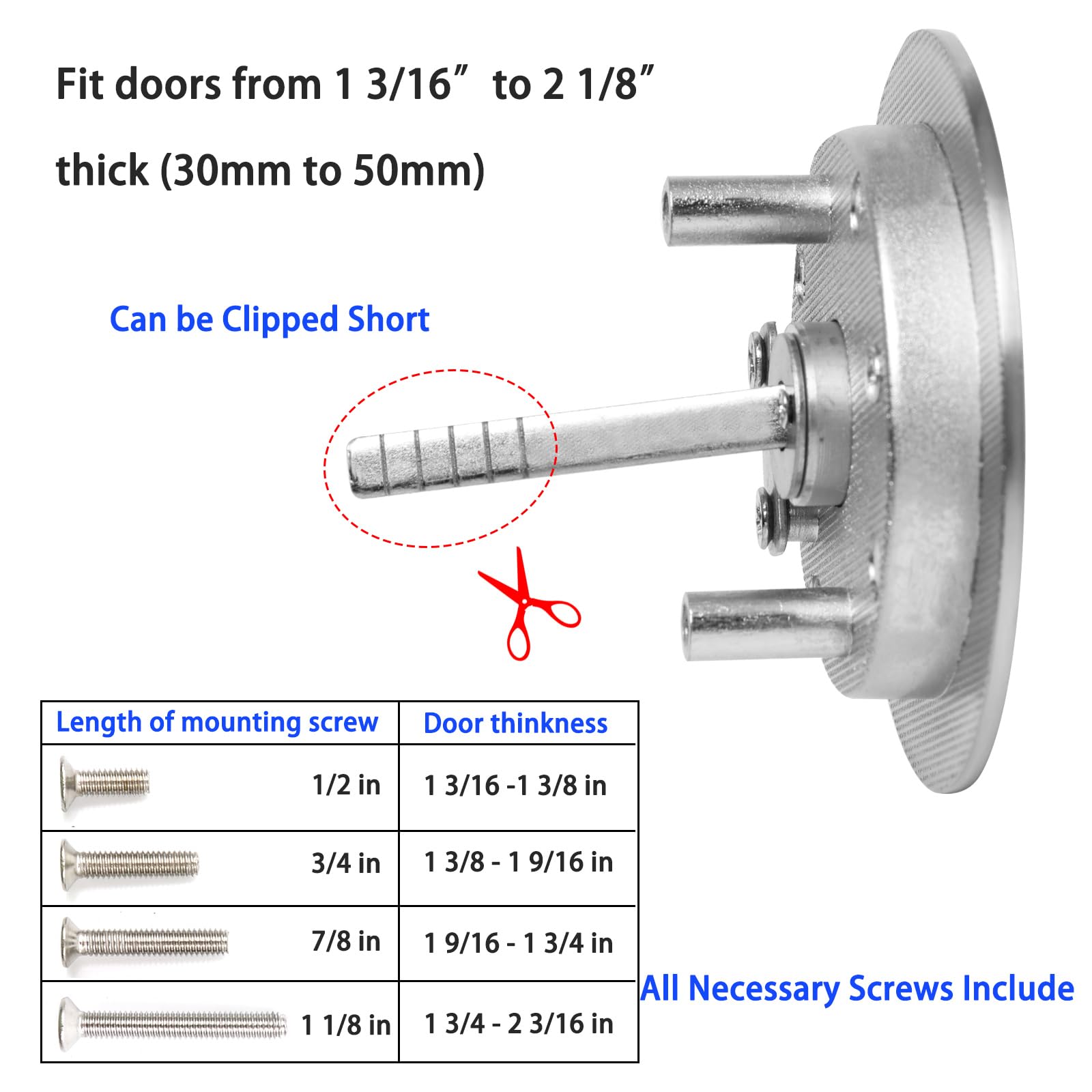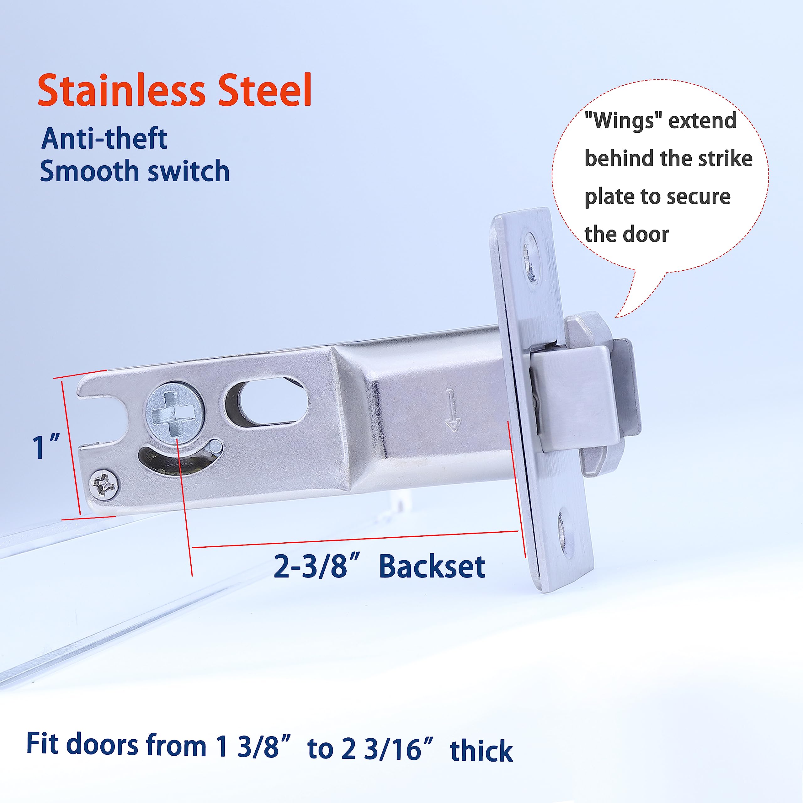 High Quality Material: Alloy steel with electroplated surface brushed nickel, and matte Black, corrosion resistant. Specification: 2-1/16” diameter hole, 1” diameter latch hole and 2-3/8” backseat.