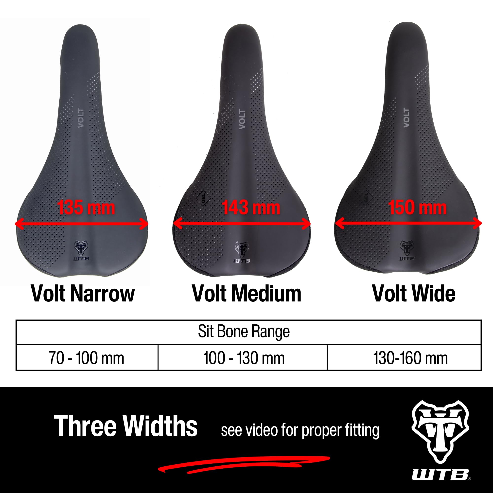 THREE WIDTHS: Perfect Saddle Fit of the Sit Bones --- Experience unparalleled support with right saddle width for your sit bones (ischial tuberosities) which are in the Narrow, Medium, or Wide version of our best-selling WTB Volt saddle, offering correct sit bone support for enhanced ergonomic fit and optimal power transmission during all your cycling adventures, from trails to road rides.