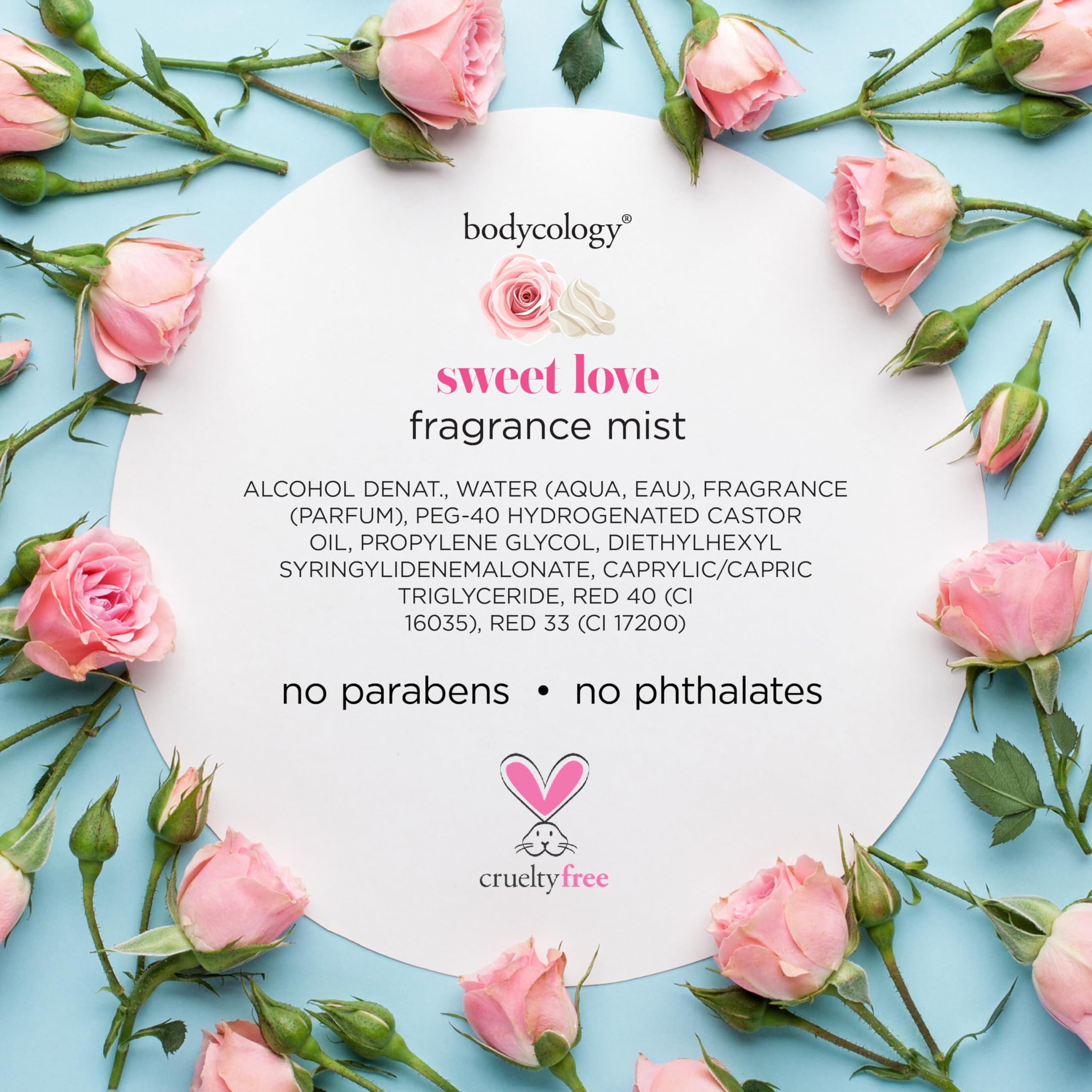 Envelop yourself in the irresistible fragrance of Bodycology's Sweet Love Fragrance Body Mist, a delightful blend of whipped cream, succulent strawberries, and comforting amber. With just a spritz or two before your day begins, you can carry the gorgeous scent of sparkling red pear, juicy cherries, and creamy sandalwood with you for hours. Luscious, fruity, and decadent, we created this fragrance with indulgence in mind. Pair it with our Sweet Love Shea Butter Body Cream for an extra treat. Mix and match with our other fragrance mists to create your unique scent. All Bodycology products are paraben, phthalate, and cruelty-free.