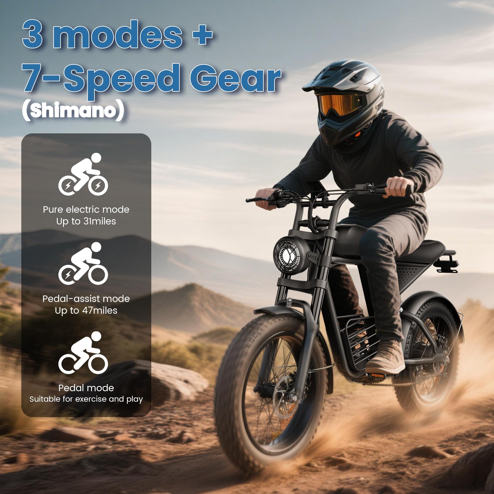 【3 Modes and 7 Speeds】It includes Pure Electric Mode, Pedal Assist Mode, and Pedal Mode. You can choose the mode that best suits your riding scenario. The professional 7-speed gear system allows smooth adaptation to various terrains, enhancing comfort and efficiency.