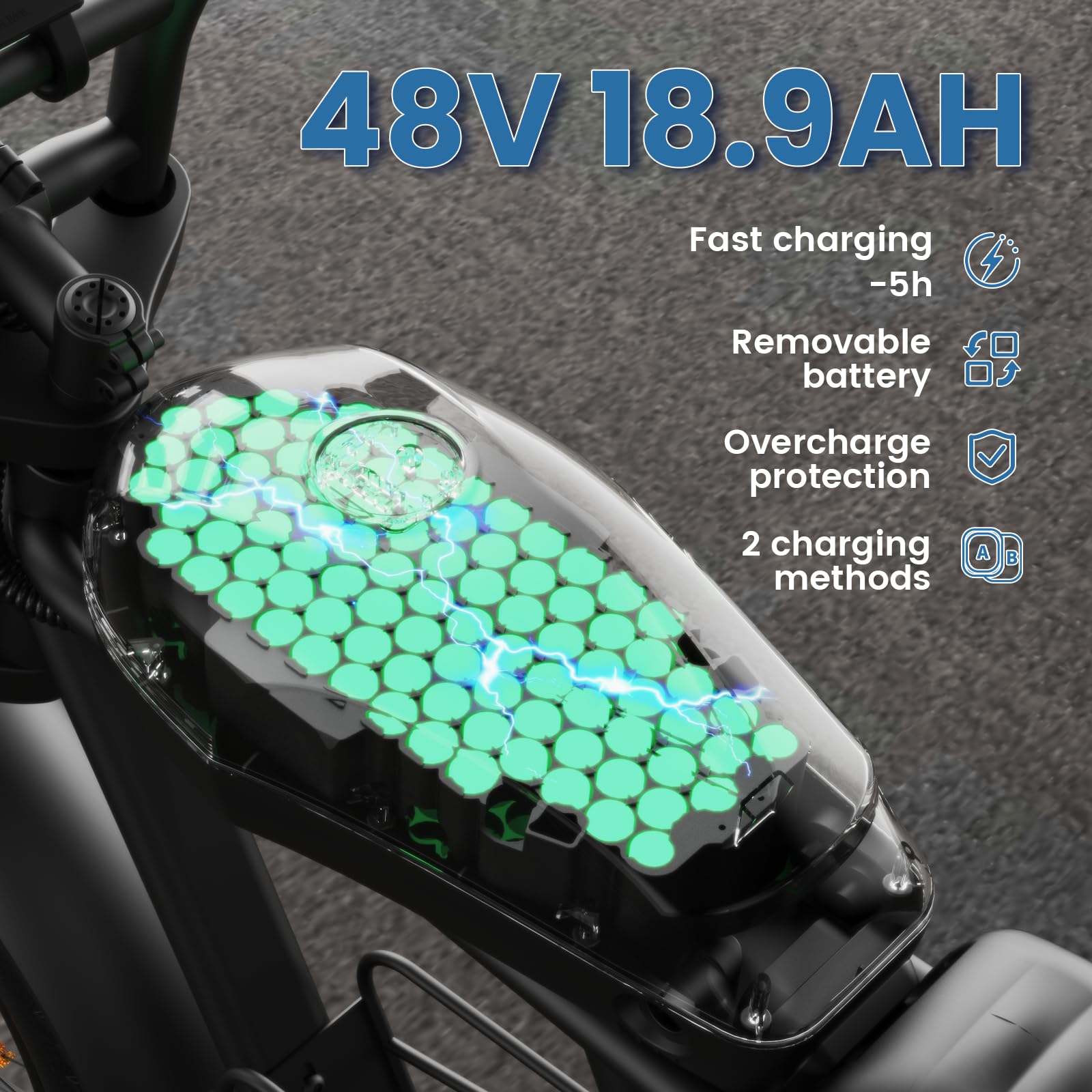 【Worry-Free Range】Features a 48V 18.9Ah large removable lithium-ion battery certified by UL2849 for safety and durability. It offers a maximum range of up to 47 miles in PAS mode. The battery also supports fast charging, with a full recharge taking only 5 hours. It includes an overcharge protection system for worry-free charging.
