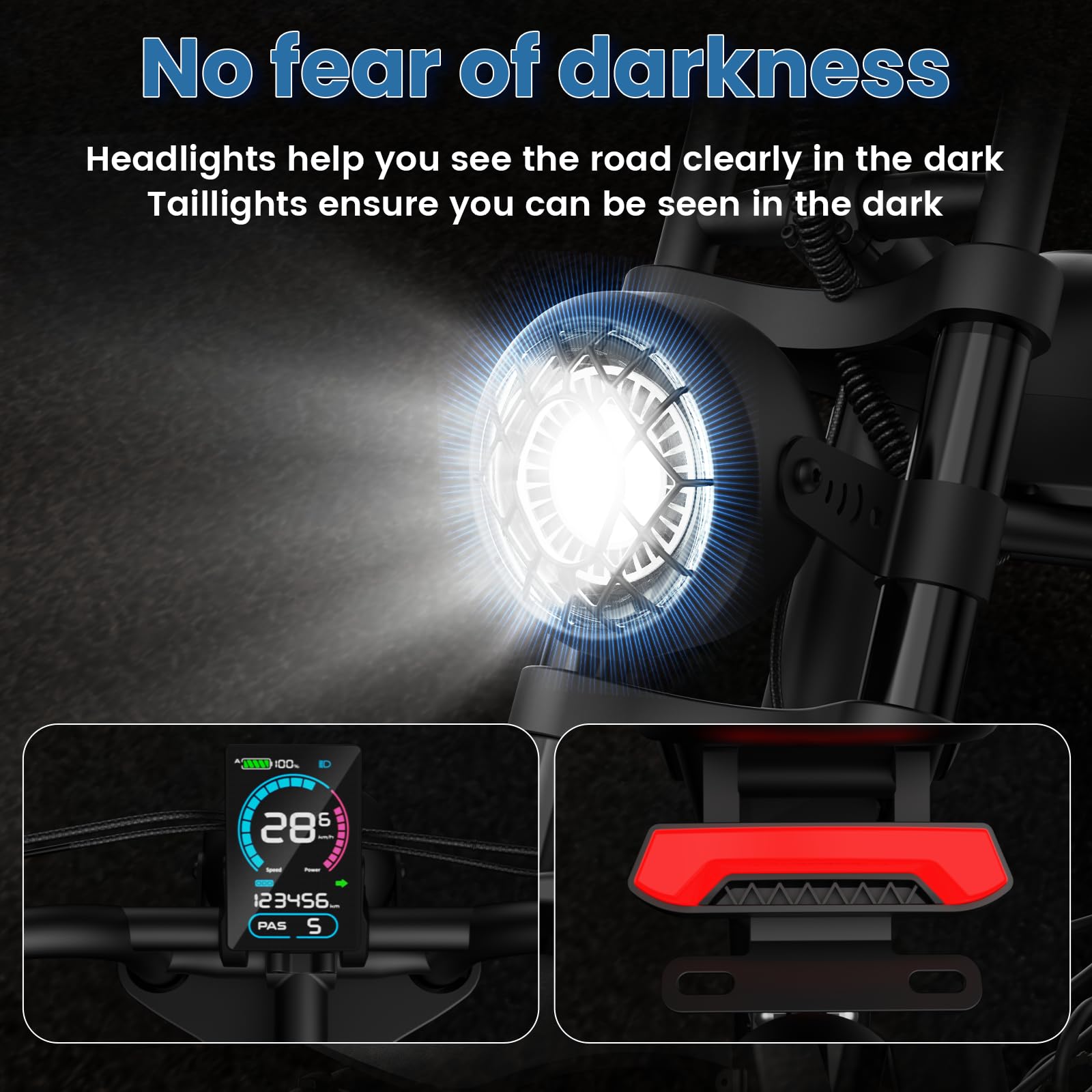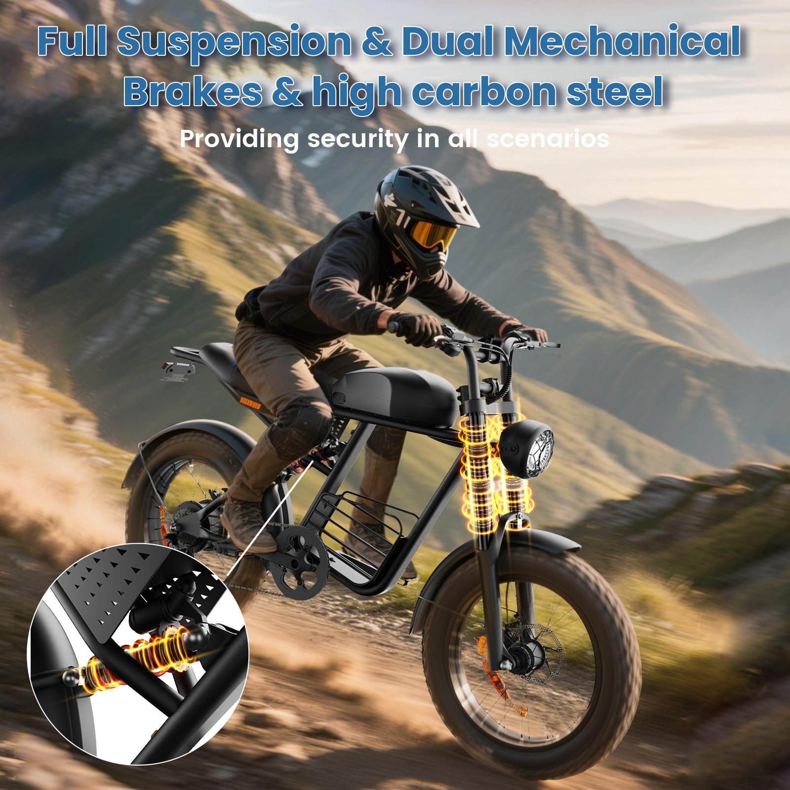 【Comfort and Safety Guaranteed】With front and rear suspension specially designed for shock absorption, this adult electric bike adapts easily to any terrain. Its dual mechanical disc brakes provide instant stopping power in all road conditions, ensuring your safety while you enjoy the ride. The high-carbon steel frame offers a stronger and safer riding experience.