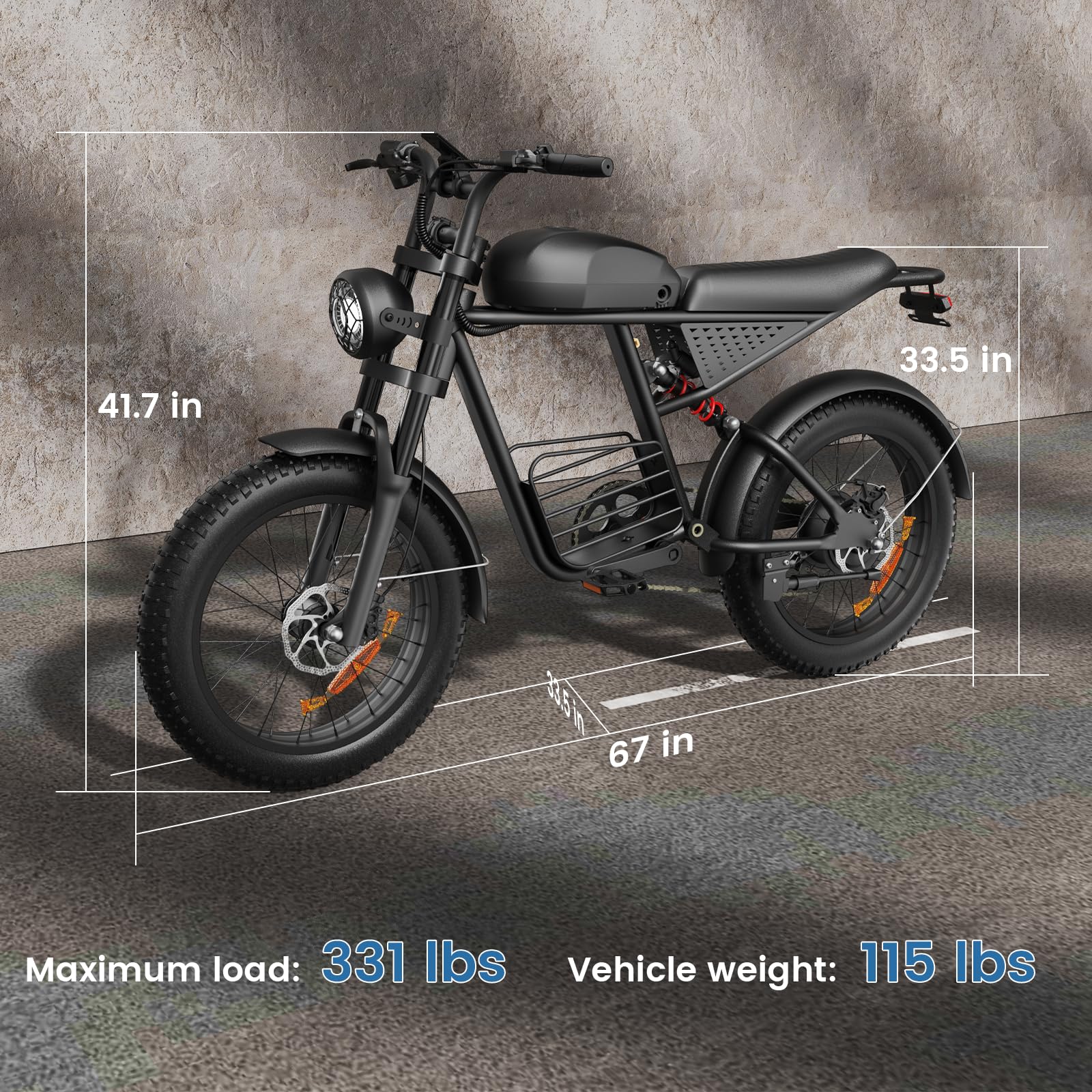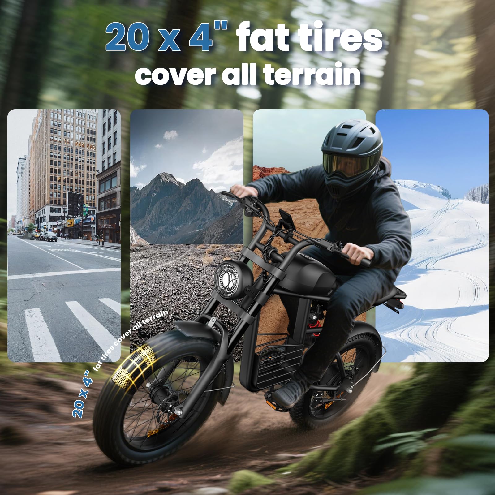 【Conquer All Terrains】This electric off-road bike is equipped with 20” x 4.0” puncture-resistant fat tires. It performs perfectly on highways, mountain paths, sand, snow, and any other terrain. Ideal for eco-friendly commuting, urban travel, mountain biking, snow riding, and outdoor adventures.
