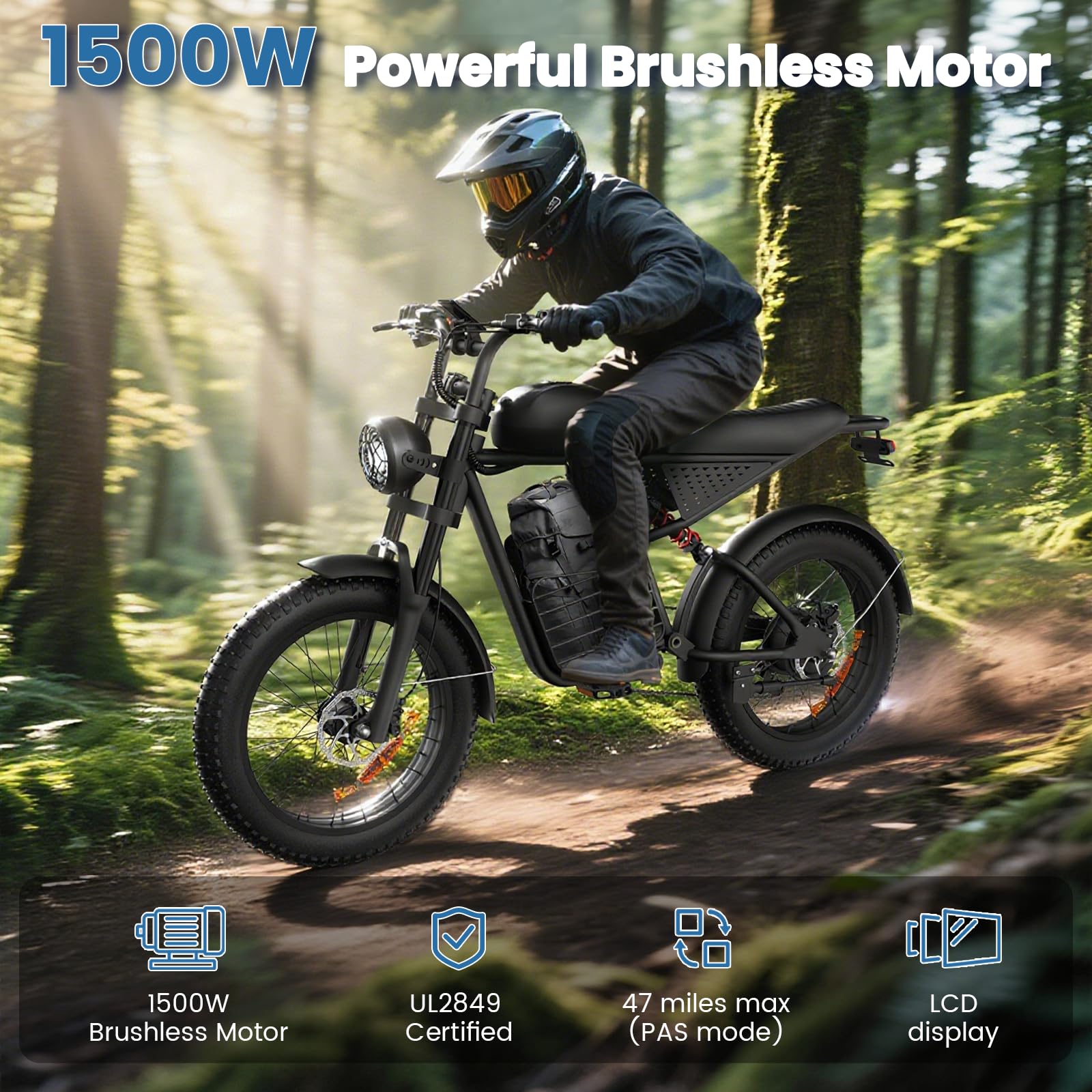 【Powerful Motor】Equipped with a built-in 1500W brushless motor that delivers greater torque and power, this adult electric bike can reach top speeds of up to 34 MPH and easily climb 30° slopes. The brushless motor provides high performance while maintaining low energy consumption and quiet operation.(For safety reasons, the bike has a 20 mph speed limit. You can remove the speed limit if needed by following the video on the product page.)