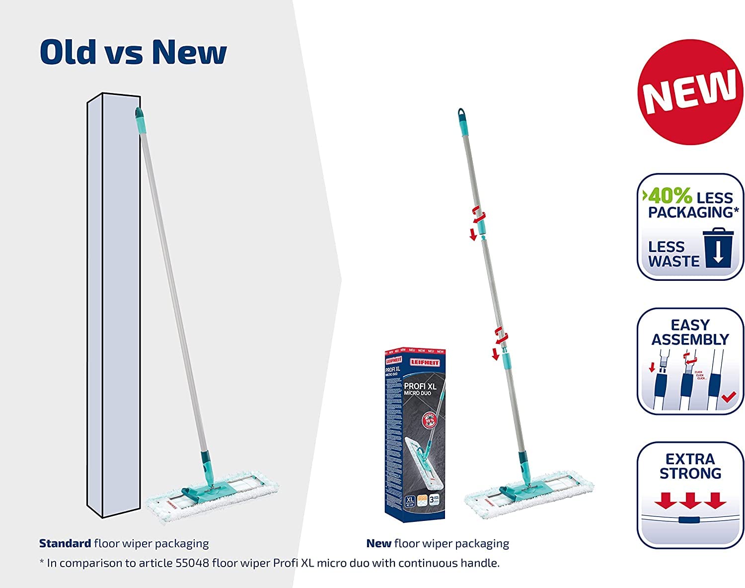 Professional standard floor mop for effective cleaning of large areas - The Leifheit Profi mop The Profi mop excels at cleaning larger areas. Its 360° swivel joint allows the mop to clean all hard to reach areas such as under beds or tables. Microfibre performs effectively as a mop head and the swivel joint allows the head to be steered into all corners. The effectiveness of microfibre means both less rinsing is required while cleaning as well as less detergent, good for both you and the environment. In fact, the average floor can be mopped without the Profi mop head needing to be rinsed once. After use you can simply throw the mop head in the washing machine and wash at 60° C. The 3 part strong - steel section handle has been developed for more friendly shipping. it is a one way fix, so when assembled it cannot be taken apart and is designed to giving long lasting performance. Supplied by Leifheit in Germany. For over 60 years, Leifheit has been one of Europe's leading suppliers of cleaning, laundry care and kitchen products. All their innovations are easy to use, work reliably, are made from enhanced materials for durability offering different practical performances. With their enhanced quality, they make life in the home easier and more convenient, giving you more time for the things you love. The product properties in detail: Microfibre mop for cleaning all areas of the home Extra large (46 cm) width Microfibre effectiveness lifts dirt easily Swivel joint for effective reach Less water and detergent required Machine-washable