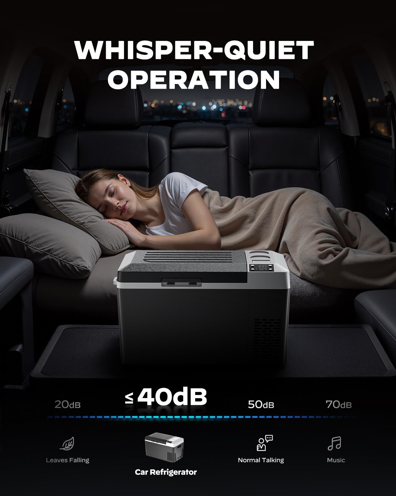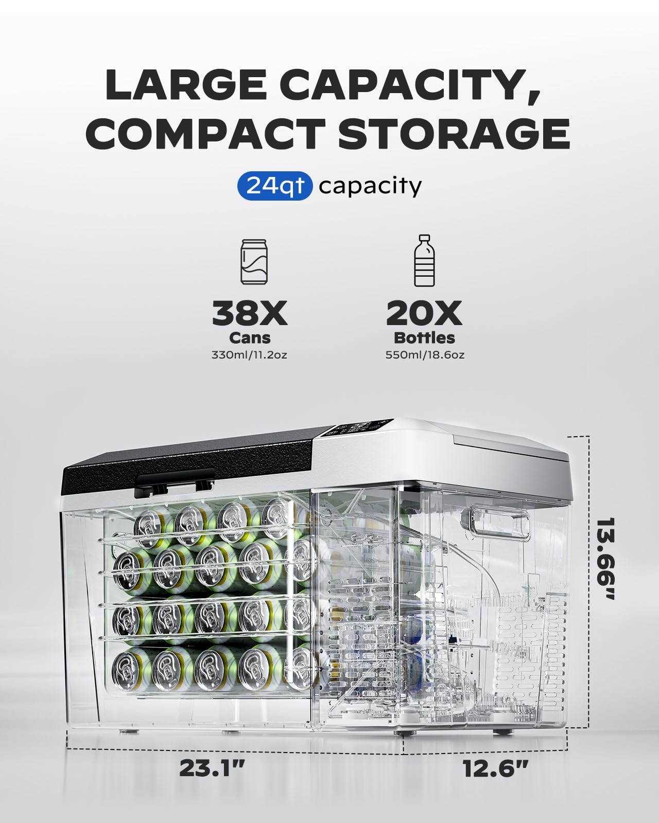 Large Capacity Compact Storage:With 24QT capacity, this car refrigerator can hold approximately 38 cans of 330ml drinks or essential snacks. This electric cooler's compact size makes it an excellent choice for short trips, weekend camping, or everyday use, offering enough space for all the essentials without taking up too much room.