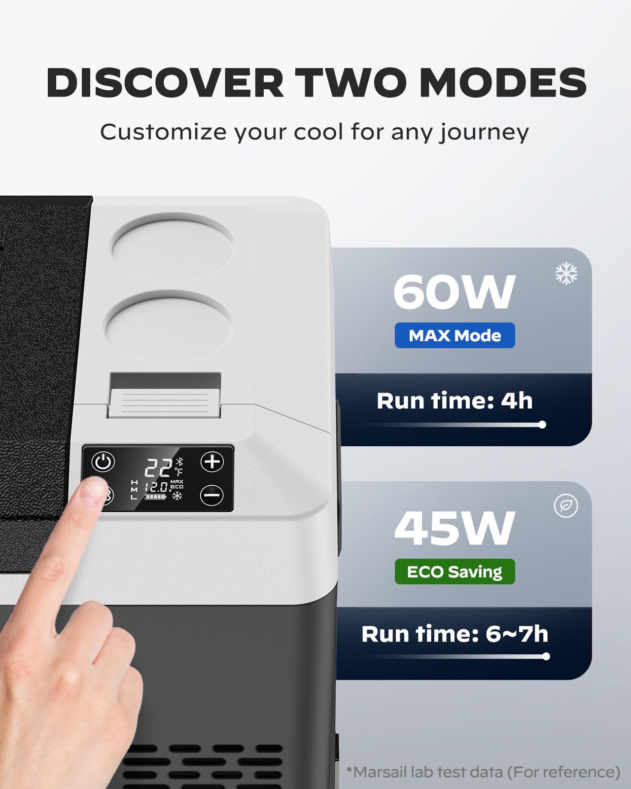 Dual Cooling Modes:Choose between MAX mode for fast and powerful cooling or ECO mode for energy-saving operation. The ECO mode of this 12v fridge helps conserve battery life, making this car fridge ideal for long trips while reducing environmental impact – a sustainable solution for cooling your food and beverages.