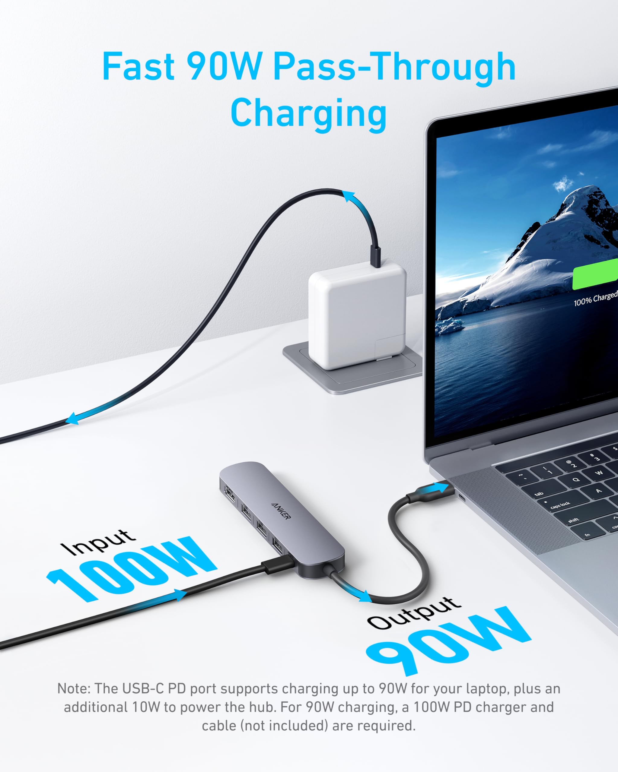 90W Pass-Through Charging: Achieve optimal charging with 90W pass-through power to your laptop, supported by a total input of 100W, with the hub reserving 10W for operational efficiency. (Note: Wall charger not included.)