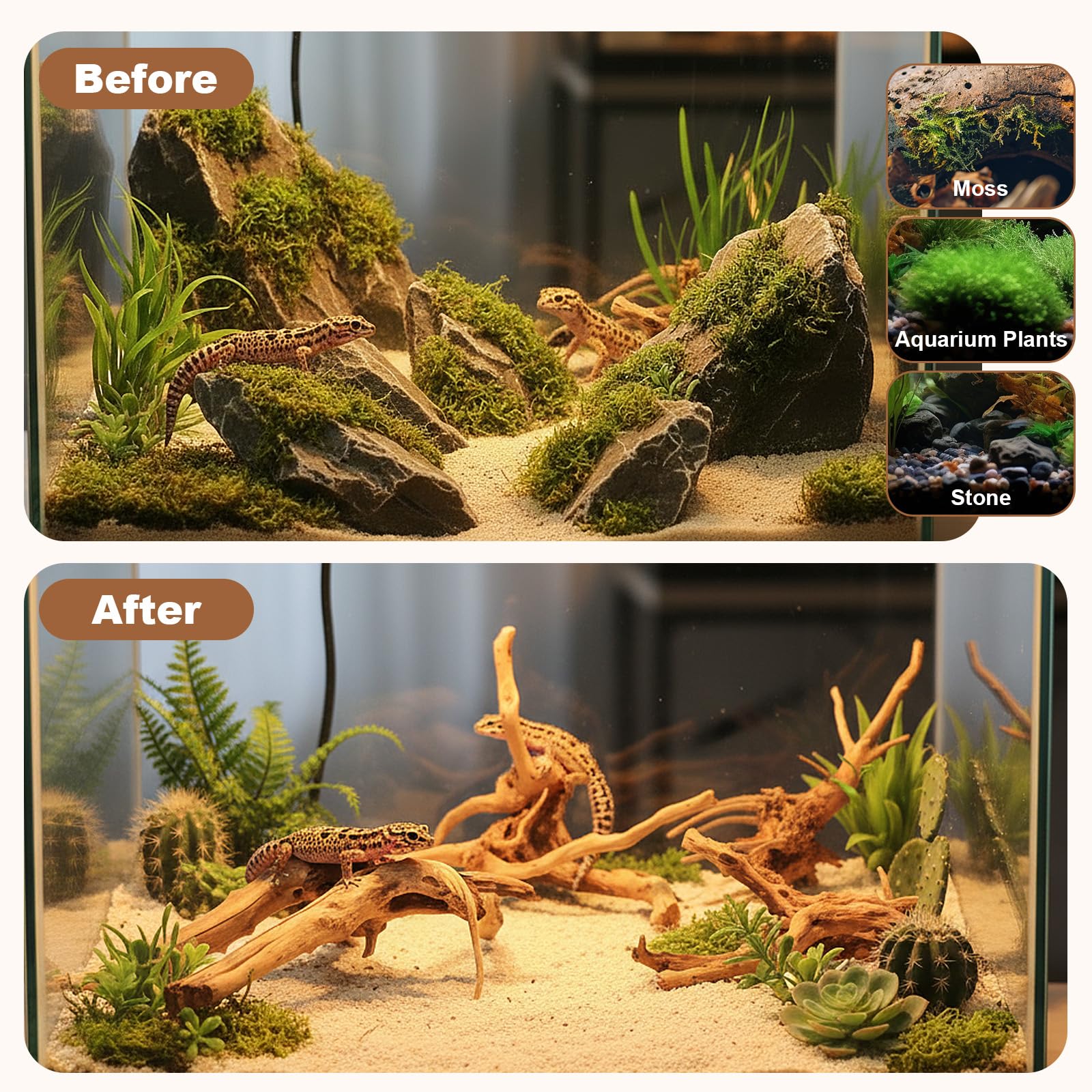 Versatile and Safe: Suitable for freshwater and saltwater aquariums, as well as reptile terrariums, it resists fading and does not pollute water quality. It can be used not only as an aquarium decoration but also as a reptile decoration, providing a safe and comfortable habitat for fish, turtles, lizards, and more