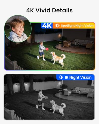4K 8MP Color Vision Day & Night: The outdoor security camera is upgraded to 4K 8MP ultra-high definition, providing unparalled visual experience for you. The built-in motion spotlight helps you see every important color detail even at night.