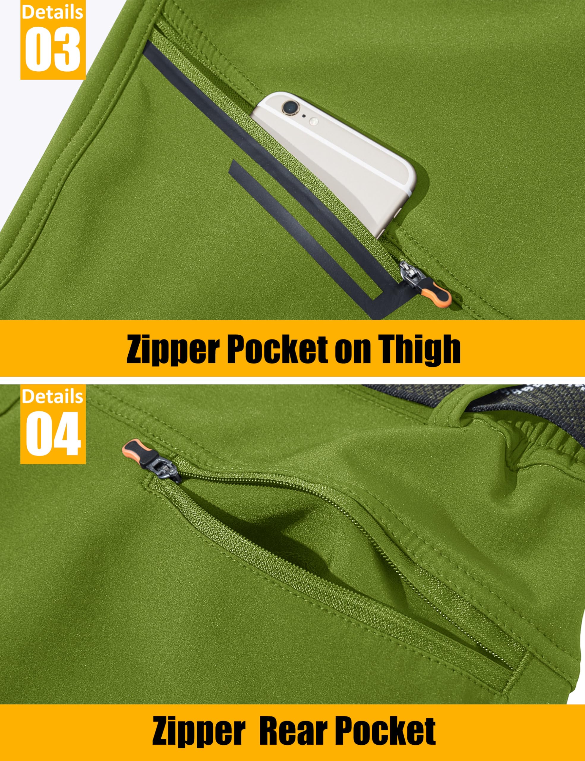4 Zipper Pockets: 2 Zipper Hand Pokets, 1 Zipper pocket on right thigh and 1 Zipper Rear Pocket, Keeping Your Essentials Securely