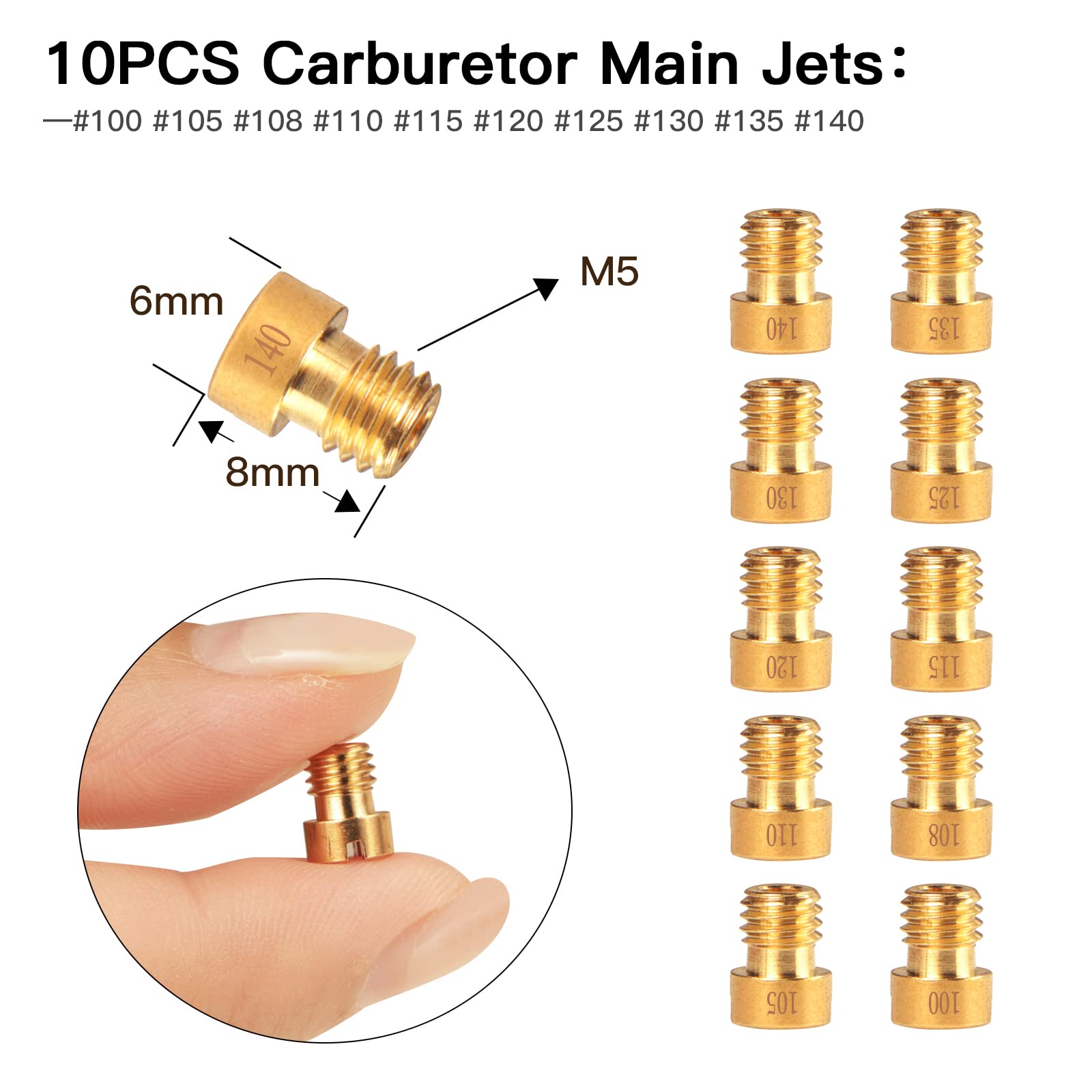 Carburetor Jet Kit Size: Carburetor Slow Pilot Jet (#32 - #55) #32 #35 #38 #40 #42 #45 #48 #50 #52 #55 Thread Size: 6mmx0.75mm ,Nut diameter: 5mm/0.19",Length: 28mm/1.1" Carburetor Main Jet(#100 - #140) #100 #105 #108 #110 #115 #120 #125 #130 #135 #140 Thread pitch: 4.7 x 2.5 mm,Nut diameter: 5.7 mm Carburetor Main Jet(#155 - #178) #155 #158 #160 #162 #165 #168 #170 #172 #175 #178 Thread pitch: 5 x 0.8 mm,Thread length: 5mm,Nut diameter: 6mm Wide application: Fit for PWK, CVK, PE type carburetor. OKO, KOSO, Stage-6, Polini and etc. Fit most scooters, ATVs, and Karts with 125cc,150cc 200cc 250cc GY6 motors Carburetors. Package Include: 10 Pcs Slow Pilot Jets 30PCS Carburetor Main Jets