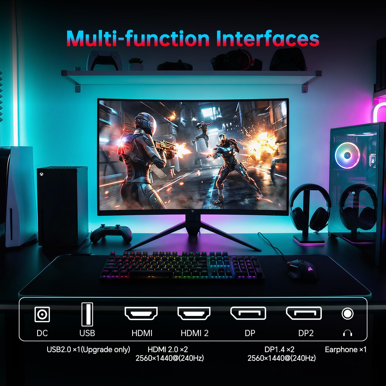 [Adundant Connectivity] Pc monitor gaming equips 2×HDMI2.0 (2560×1440@240Hz), 2× DP1.4 (2560×1440@240Hz), 1×USB2.0 for enhanced gaming connectivity.