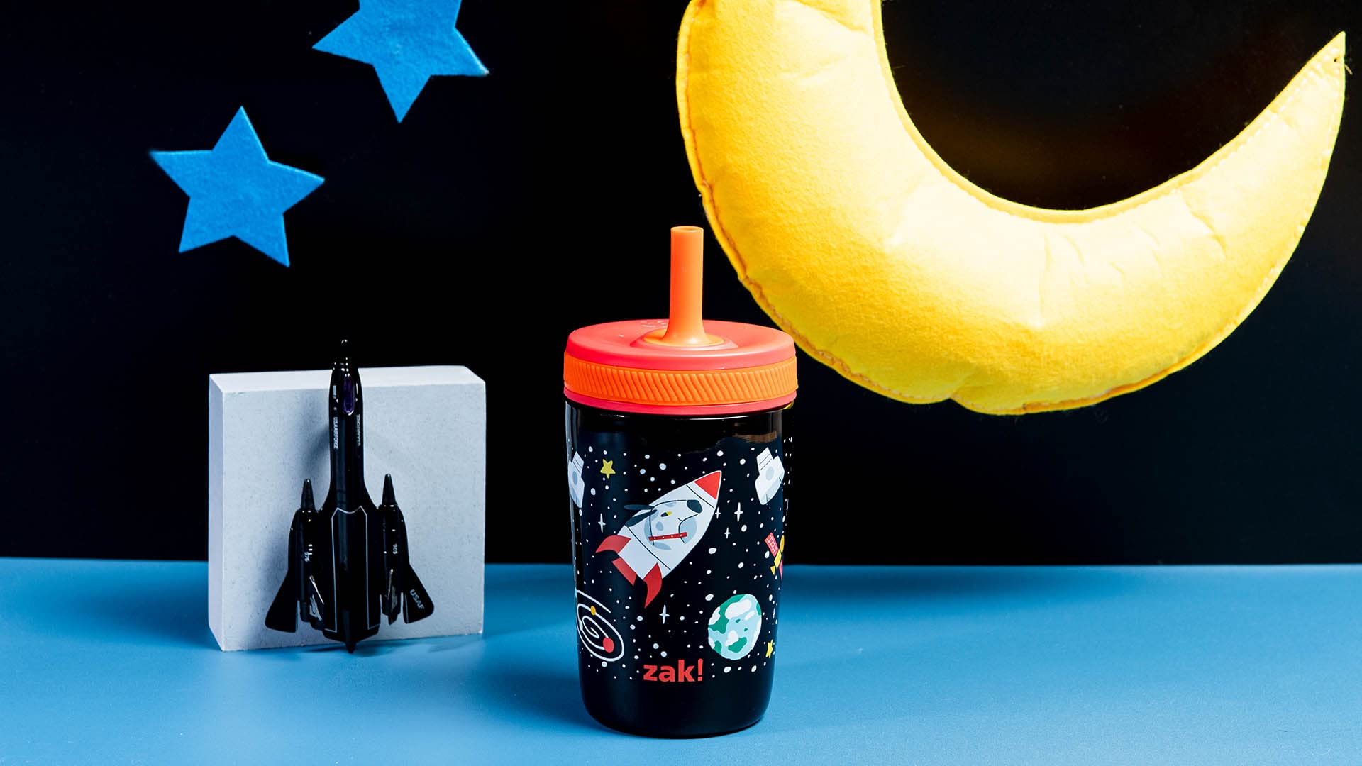 This leak-proof tumbler from Zak Designs makes hydration fun for kids! Durable Materials: The tumbler is made from food-grade, 18/8 stainless steel, and the comfortable straw is made from silicone. Everything is completely BPA free, and the lid can be disassembled for easy cleaning. Leak-Proof Straw: The straw spout has a built-in valve that allows liquid to flow when drinking and prevents spills when the tumbler is tipped over. It's perfect for travel or for young children graduating from sippy cups. Vacuum Insulation: The stainless steel tumbler has vacuum insulation that keeps drinks cold for up to 10 hours, so your water is always refreshingly chilled. The double-wall construction also prevents condensation from forming on the outer walls, eliminating messy water rings.Hydrate Anywhere: The tumbler won't splash or leak and fits in car cup holders, making it ideal to take on the go. At home, you don't have to worry about spills or stains around fabrics or electronics, and drinks stay easily accessible through the straw. Specifications: 12 oz capacity. Vacuum insulated. Made of durable stainless steel and silicone. BPA-Free - Zak is committed to safety. Hand wash tumbler, top rack dishwasher safe, do not microwave. Length: 3.2-inch, Width: 3.2-inch, Height: 6.77-inch. Design: Spaceships.