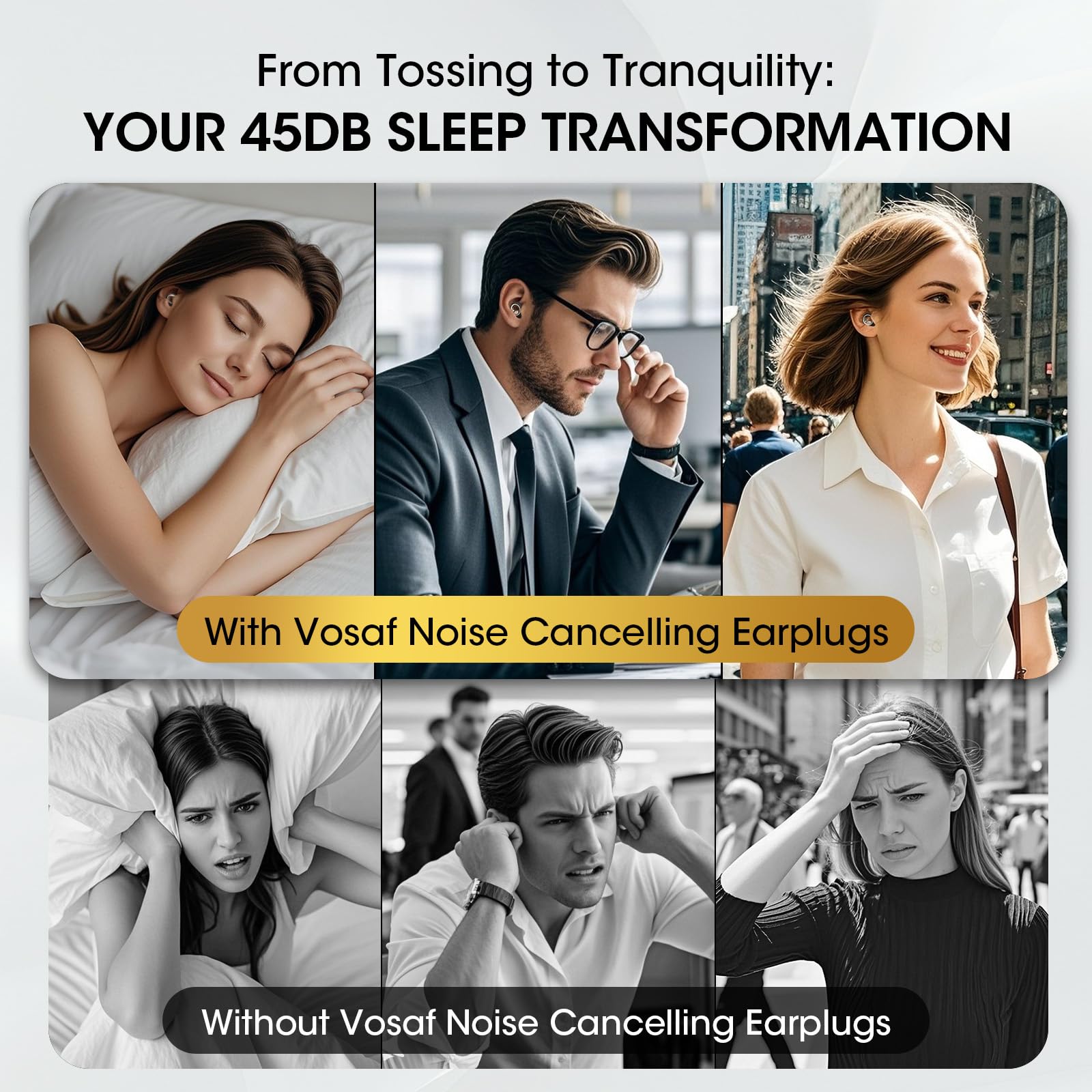 🌙 Block the Noise, Sleep Better – Proven 95% Noise Reduction--Backed by lab testing, Vosaf ear plugs for sleeping noise cancelling block up to 95% of disruptive sound. Whether it’s 30dB traffic noise, 25dB snoring, or airplane engines over 80dB, Vosaf lowers the noise to a peaceful level so you fall asleep 2x faster and wake up refreshed