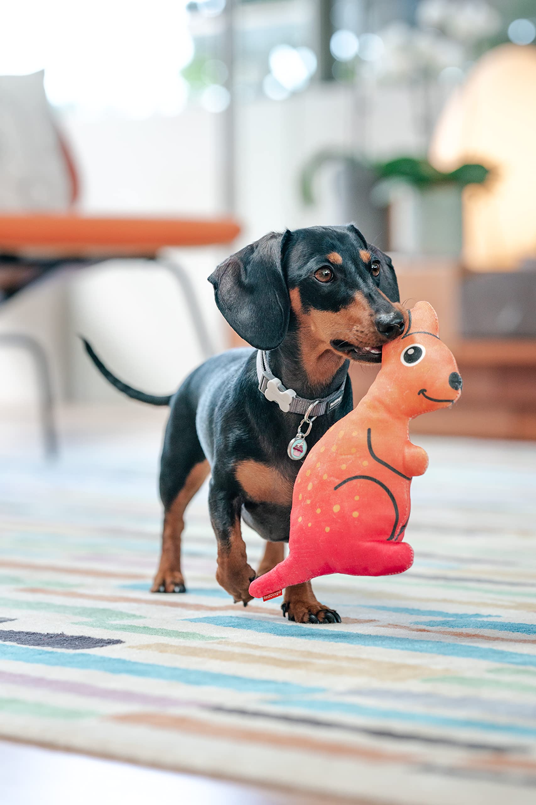 This Red Dingo Kangaroo soft toy is exceptionally durable, surpassing the toughest fabric dog toys. Its size is ideal for most medium to large dogs. Crafted from ultra-durable, yet teeth-friendly, certified non-toxic material. Red Dingo DURABLES, having undergone rigorous testing, excel in resisting tears, cuts, and punctures compared to other fabric dog toys.
