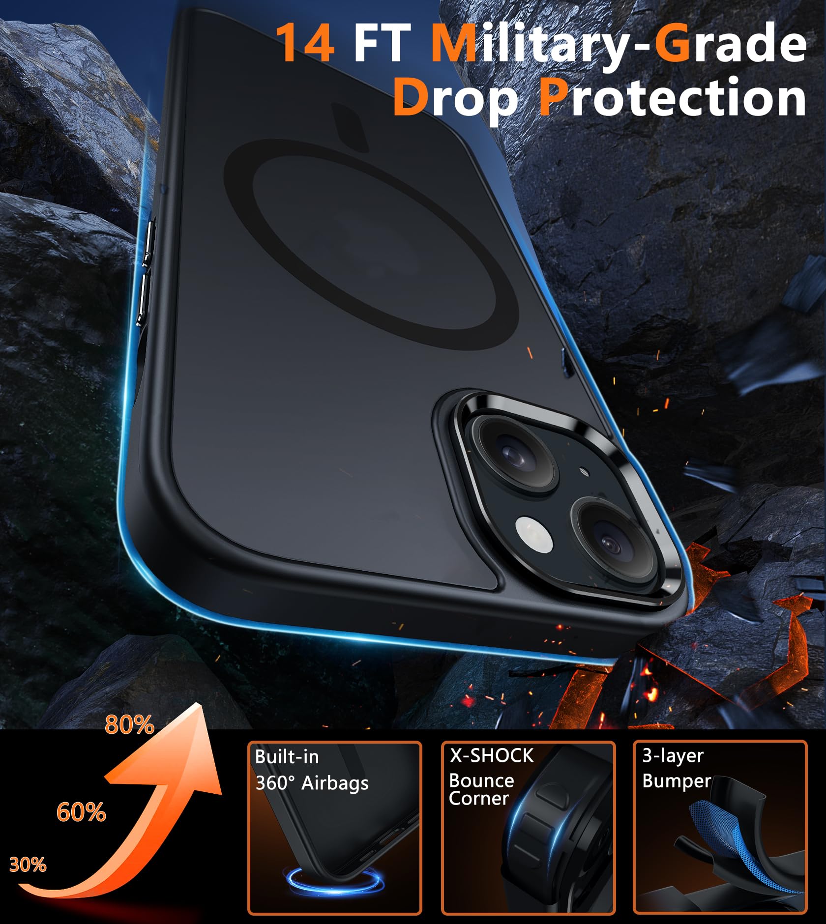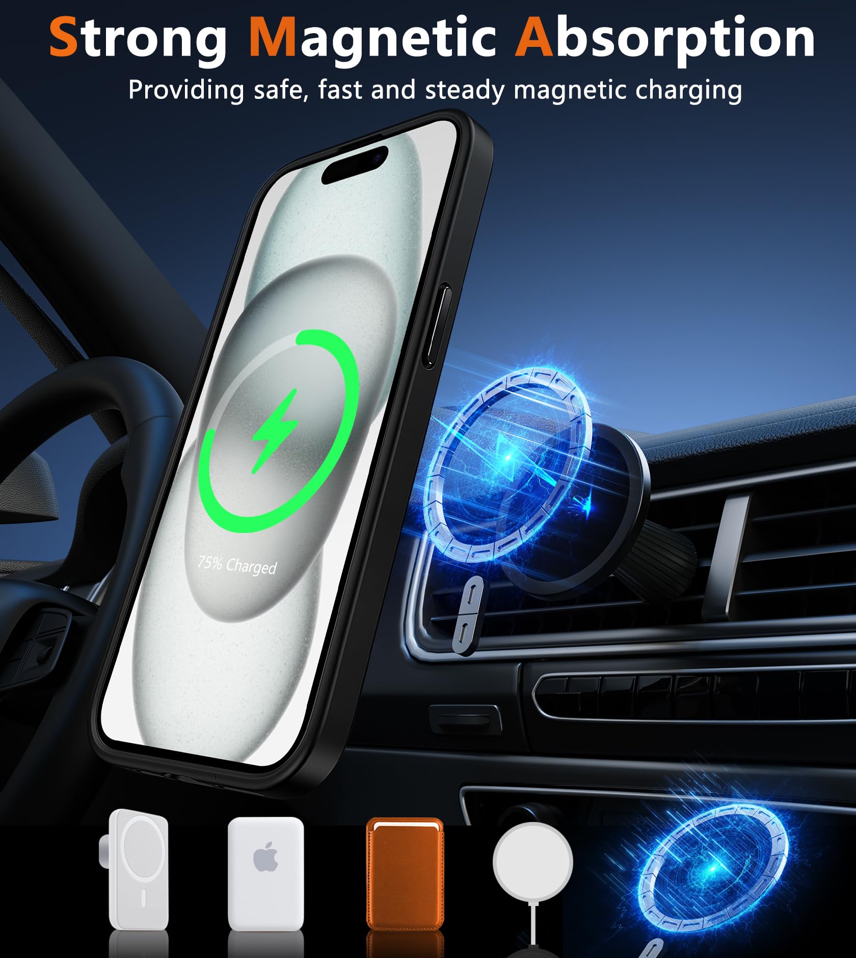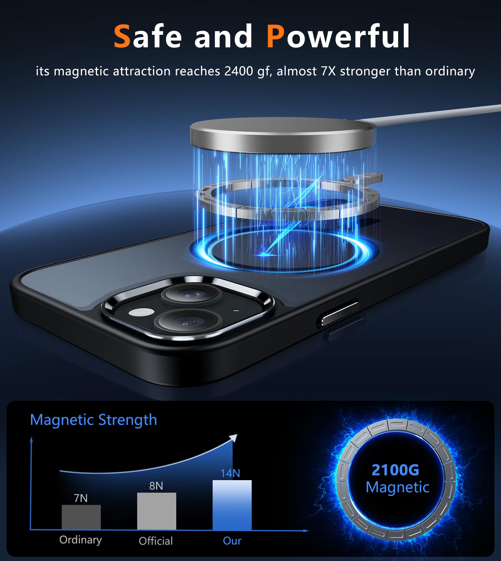 Powerful Magnetic Force: Aligns perfectly with wireless power bank, wallets, car mounts and wireless charging stand. The iPhone 15 plus magnetic case has built-in 38 super N52 magnets. Its magnetic attraction reaches 2400 gf, which is almost 7X stronger than ordinary, therefore it won't fall off no matter how it shakes when you are charging