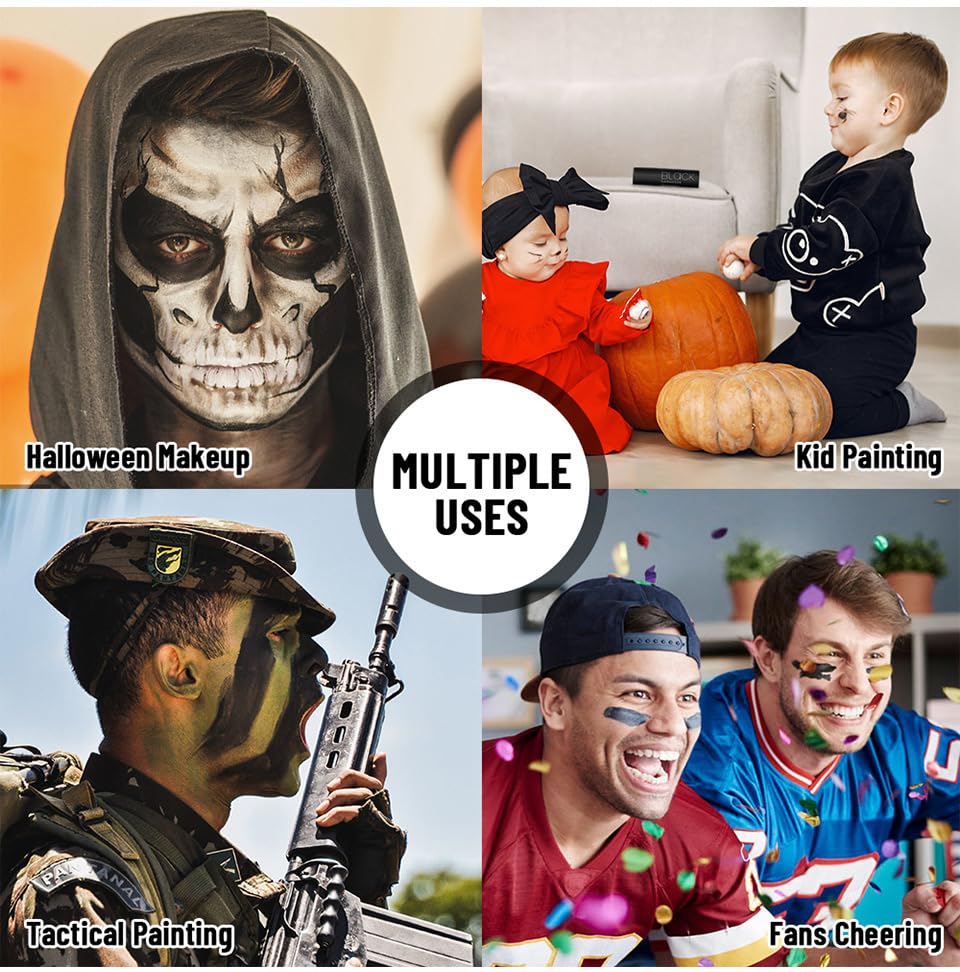 ✔Multipurpose:Multipurpose face painting stick,not only used as face body paint stick for Halloween Costume theme,fancy ball, parties, club,photoshoot,skeleton makeup,goths look, vampires, clowns, zombies,superhero designs,or other more SFX cosplay makeup,but also used as eye black stick for baseball,softball,football,little league,hockey game,any tournament or extreme sport photography,and other more sporting occasion