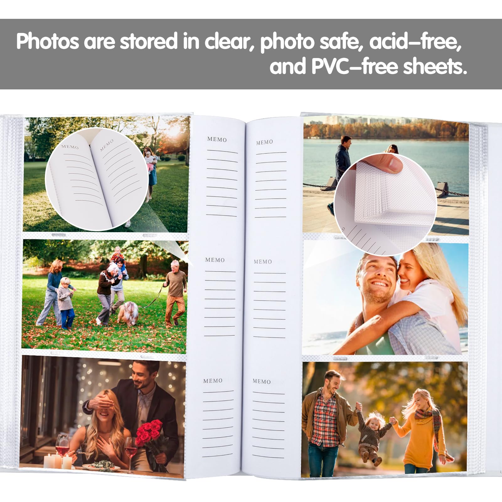ACID-FREE PHOTO ALBUM 4x6: The inner pages is designed with acid free and PVC free material between high transparent film slots, stopping photos from sticking together, prolonging their life and keeping your photos air free and dustproof, tear resistant, high transparency pocket pages, restores the true color of the photos.