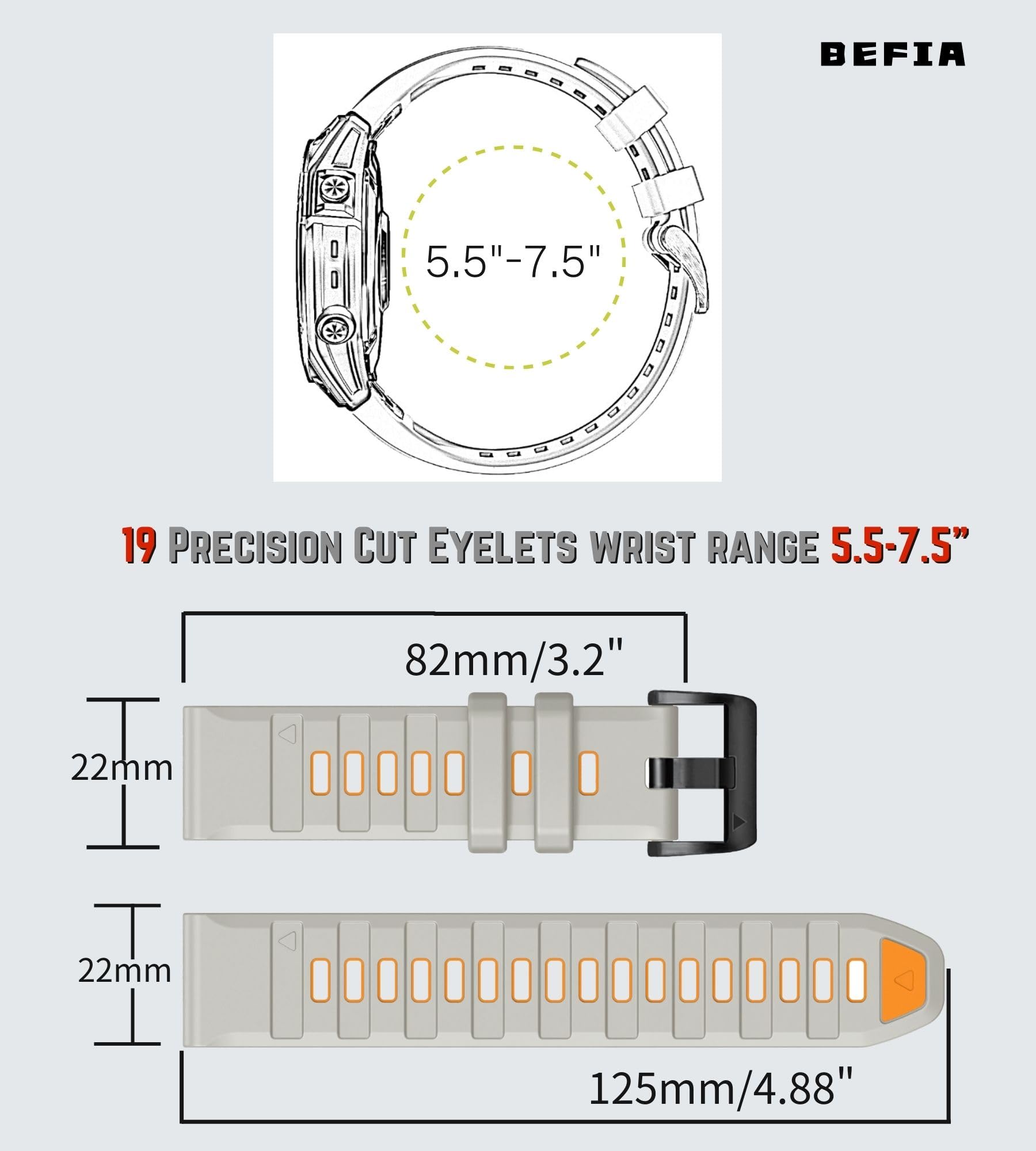 Description Never Lose Focus During Your Adventure Tired of watch bands that slip during critical moments? Our 22mm quickfit silicone strap locks securely through marathons, trail runs, open-water swims, triathlons, kayaking, and rock climbing. No more stopping to adjust mid-race! Breathe Easy in Water & Sweat Specially designed ventilation channels keep your skin dry during lap swimming, surfing, paddleboarding, or HIIT workouts. Say goodbye to skin irritation caused by trapped moisture. Your Style, Your Day Match your active lifestyle with 10 vibrant colors: - Gym Beast: Neon Red/Lime Green - Office Ready: Classic Black/Midnight Grey - Weekend Explorer: Army Green/Navy Blue - Sunset Vibes: Coral Orange/Burgundy Quick change design lets you switch styles for yoga class, business meetings, or date nights in seconds. Rubber Band Replacement Engineered for Garmin Fenix 8 47 mm 7 6 Warriors Precisely crafted for 22mm QuickFit connectors on: 22mm watch band compatible with Garmin Fenix 8 47mm | Fenix 7 Pro/Sapphire | Fenix 6/6 Pro | Forerunner 955/965 *Not compatible with Fenix 7X/6X/5X or Epix 51mm models Why Athletes Choose This Band Saltwater-proof performance for ocean swimmers Non-slip grip during muddy trail runs Zero residue after sweaty cycling sessions Quick dry material for multi-day hikes Technical Details Material: Perforated medical silicone Buckle: Reinforced Metal Pin Buckle Band width: 22mm Quick Fit standard Weight: 1.06oz - Lighter than original bands