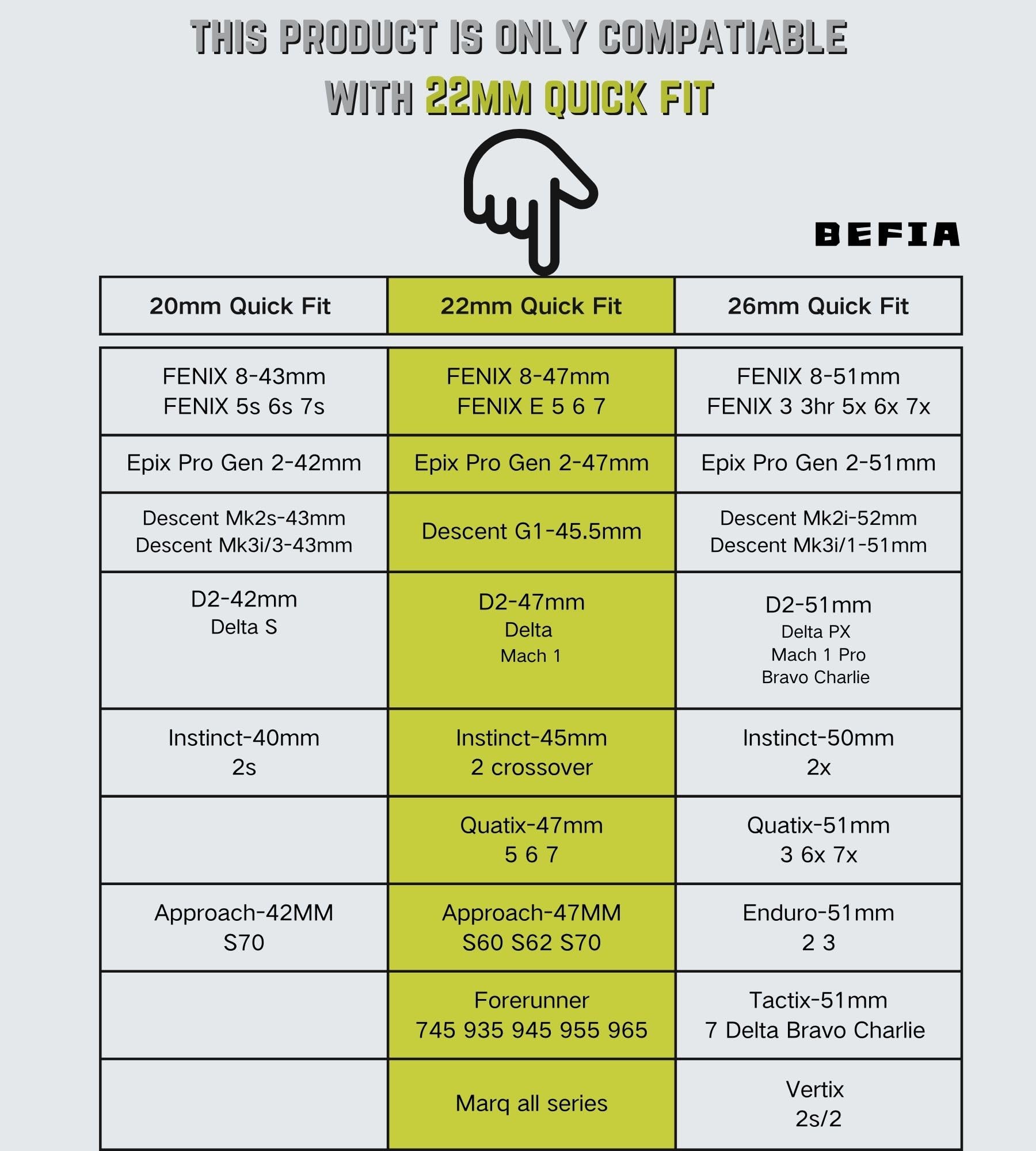 Stop Slipping, Start Dominating Your Workouts:Tired of your Fenix 8 47mm fenix 7 pro sapphire solar fenix 6 pro solar watch sliding during burpees? Our 22mm QuickFit replacement band grips through ocean swims, and mountain biking. The Metal buckle stays secure even when climbing Half Dome.