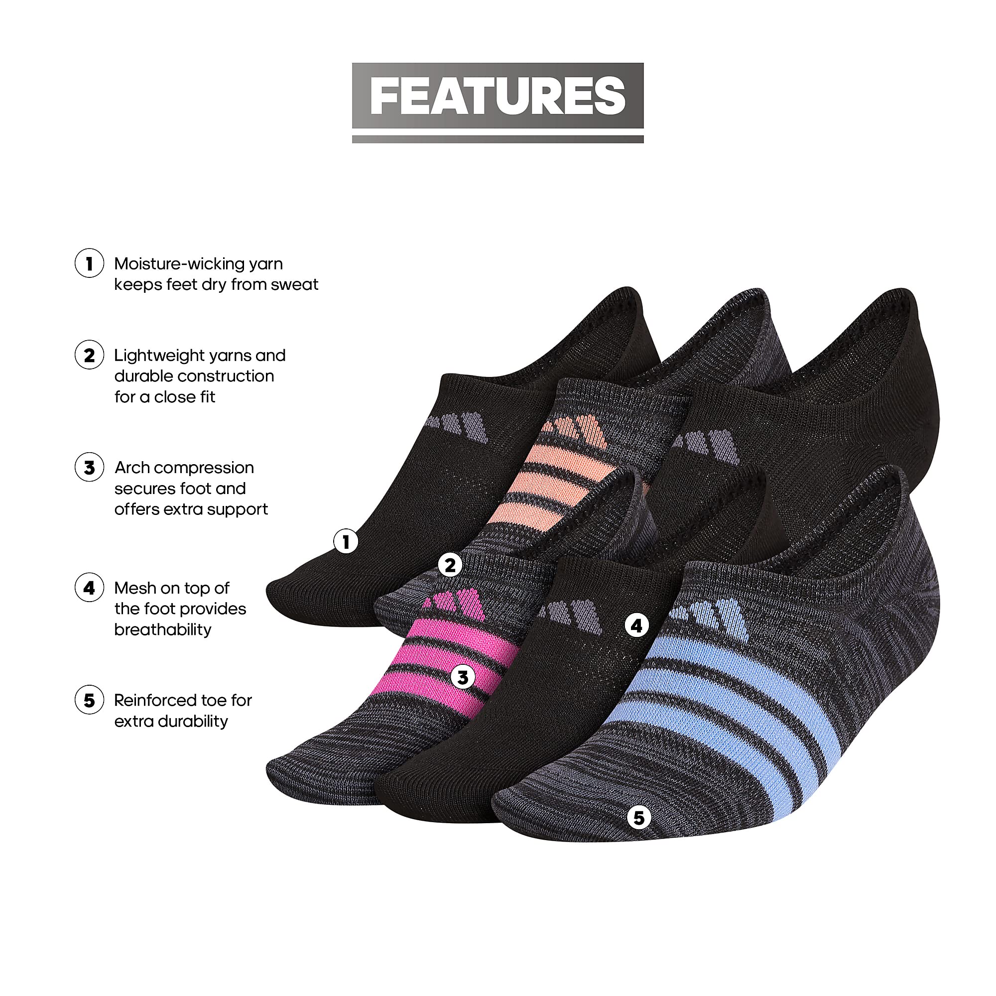 Description Push through your limits in comfort. These sneaker socks are built with extra ventilation to keep your feet dry and feeling fresh, even during demanding workouts. A reinforced toe and arch compression add durability and support to each step.