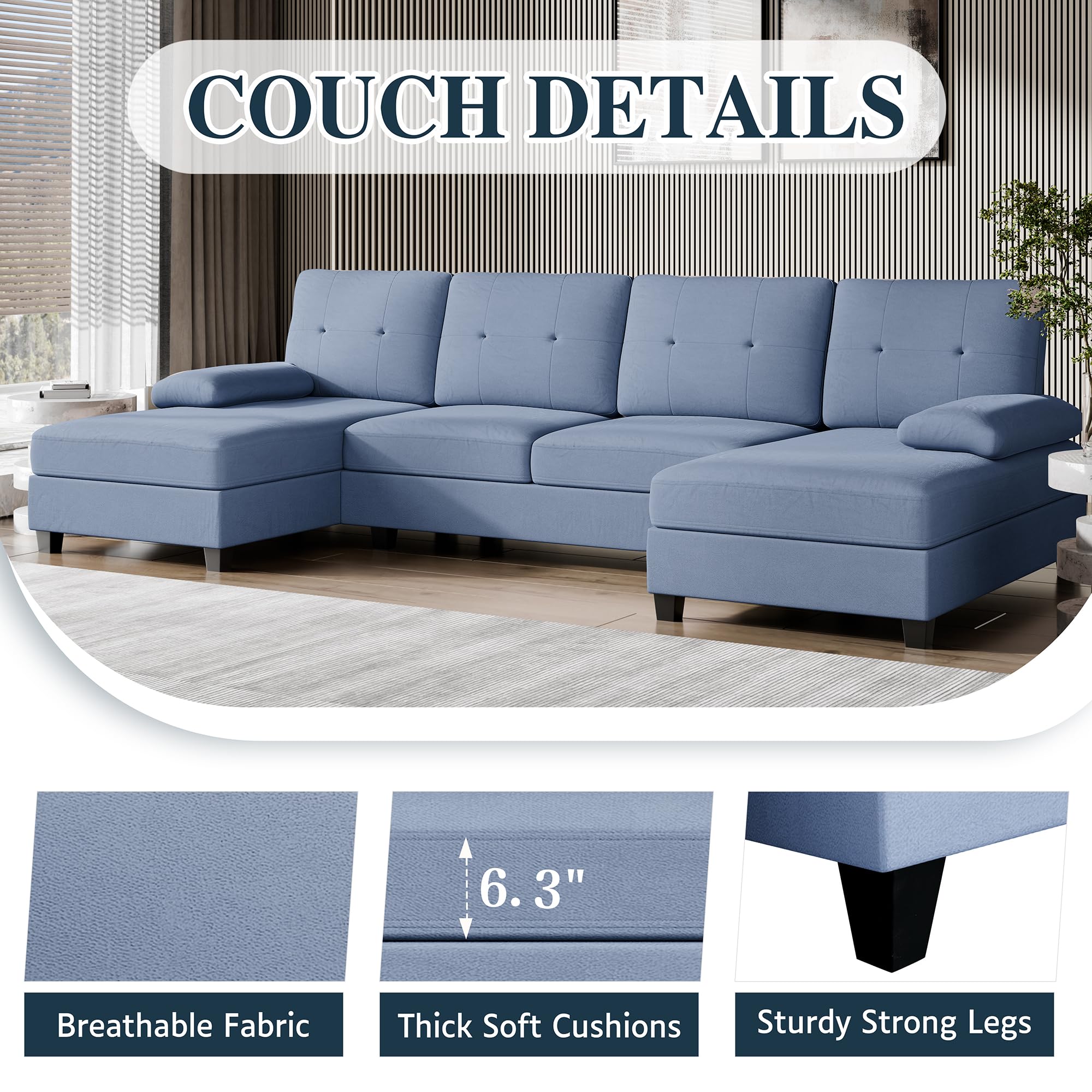 [HIGH QUALITY] Wood frame and breathable fabric surface, this couch is definitely sturdy for long-time use. 300lbs for each seat. Overall dimension of this couch: 106.3" x 50.4" x 33.9". Seat height: 16.1". With 2 wide chaise lounges, the sectional couches for living room can seat up to 4 people together. Please take care of the product size