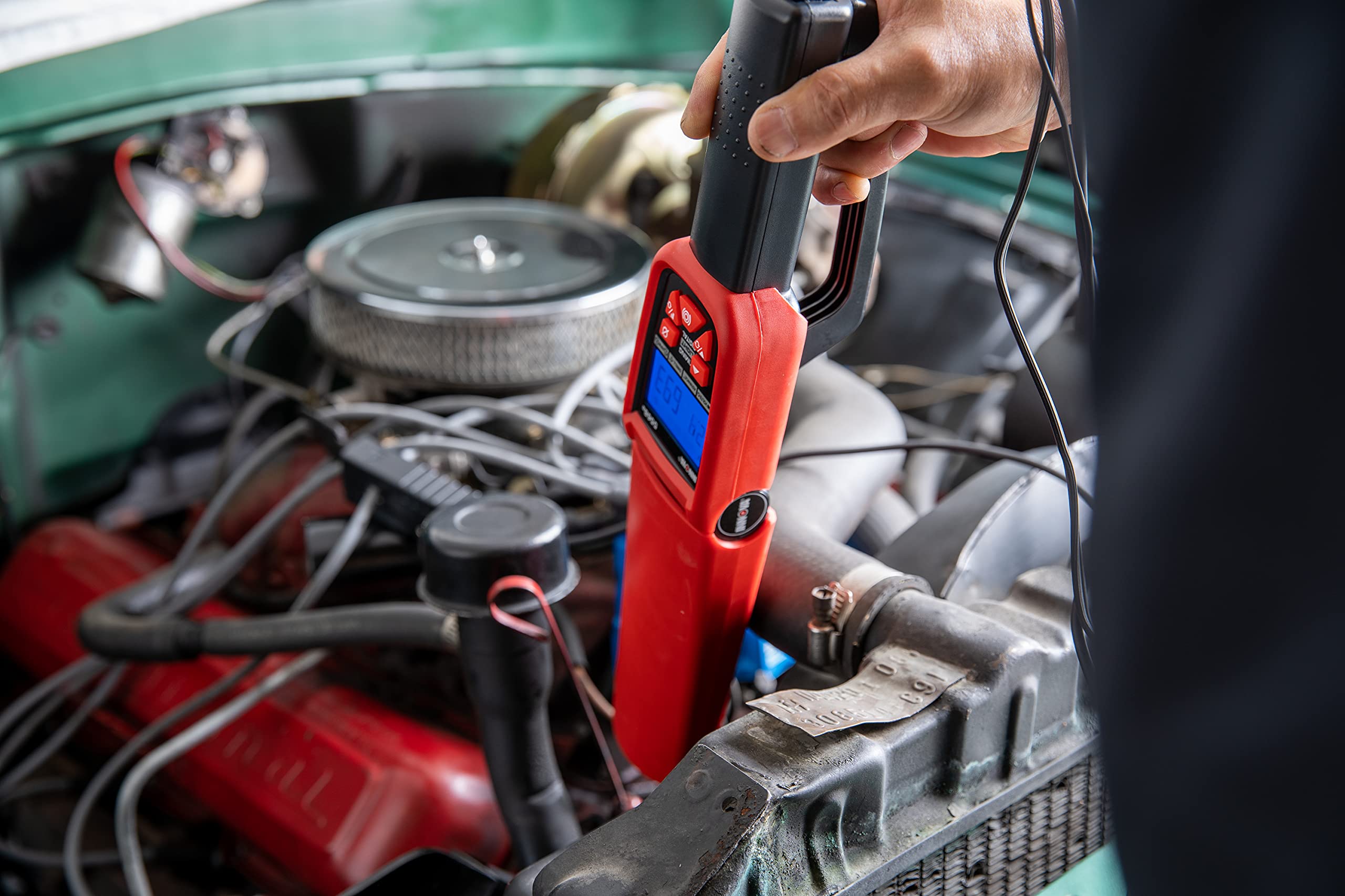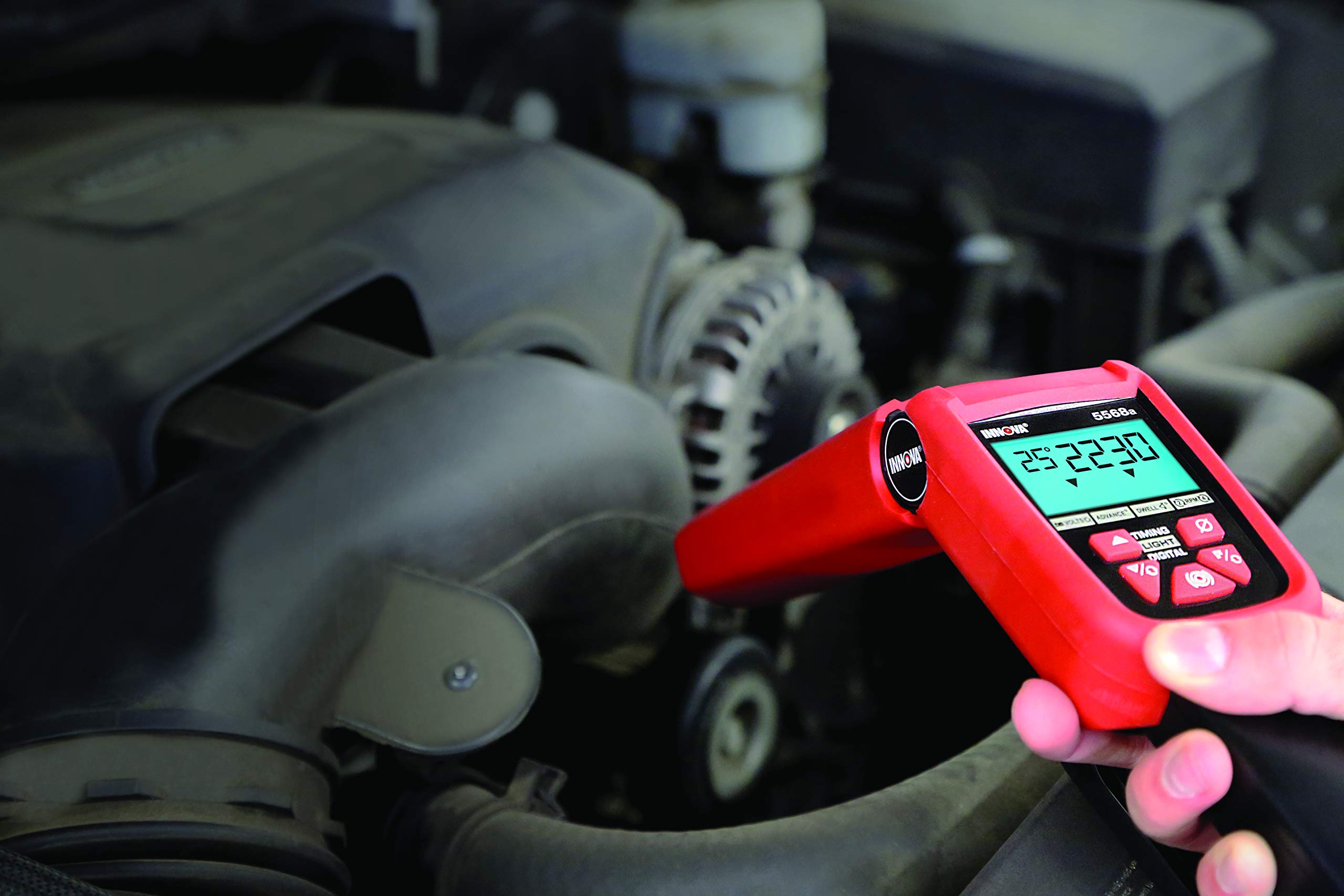 The INNOVA Pro Digital Timing Light is the professional choice for a high-quality timing light that will stand up daily shop use. Made from a heavy-duty, ABS, shock proof housing it has a molded boot for extra protection against the engine fan blades and a backlit screen for easier viewing in hard to see places. The slim, rotating barrel offers better aim at the timing mark. The four-function digital readout includes tachometer ranges from 249-9,990 RPM, Advance Degrees (2 and 4 cycle) 0-90 degrees, dwell (2-12 cylinders) from 0-180 degrees and voltage from 10-16 volts DC. Features Patented Skip Circuitry Test up to 9,990 RPM and switches from 2-cycle to 4-cycle. This timing light works with most ignition systems (DIS, conventional, electronic, and computer-controlled systems - domestic and import). The INNOVA Pro Digital Timing Light includes detachable 6-foot leads with inductive pickup and a plastic storage case.