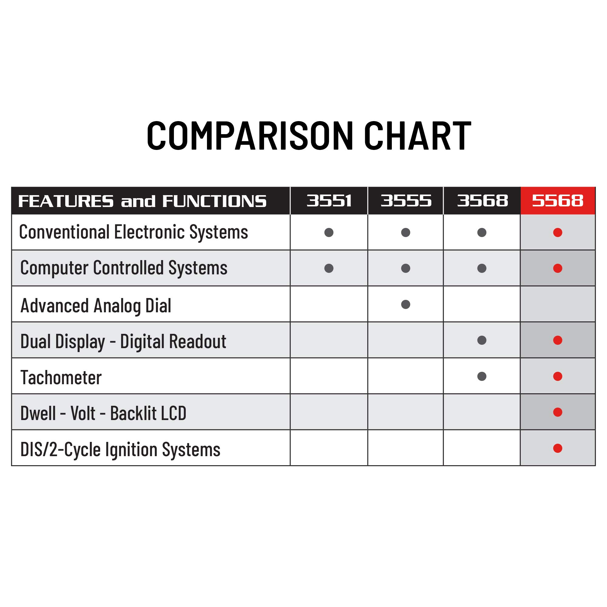 Four function digital readout: Tachometer; Advance; Dwell; and Voltage.Fit Type: Universal Fit