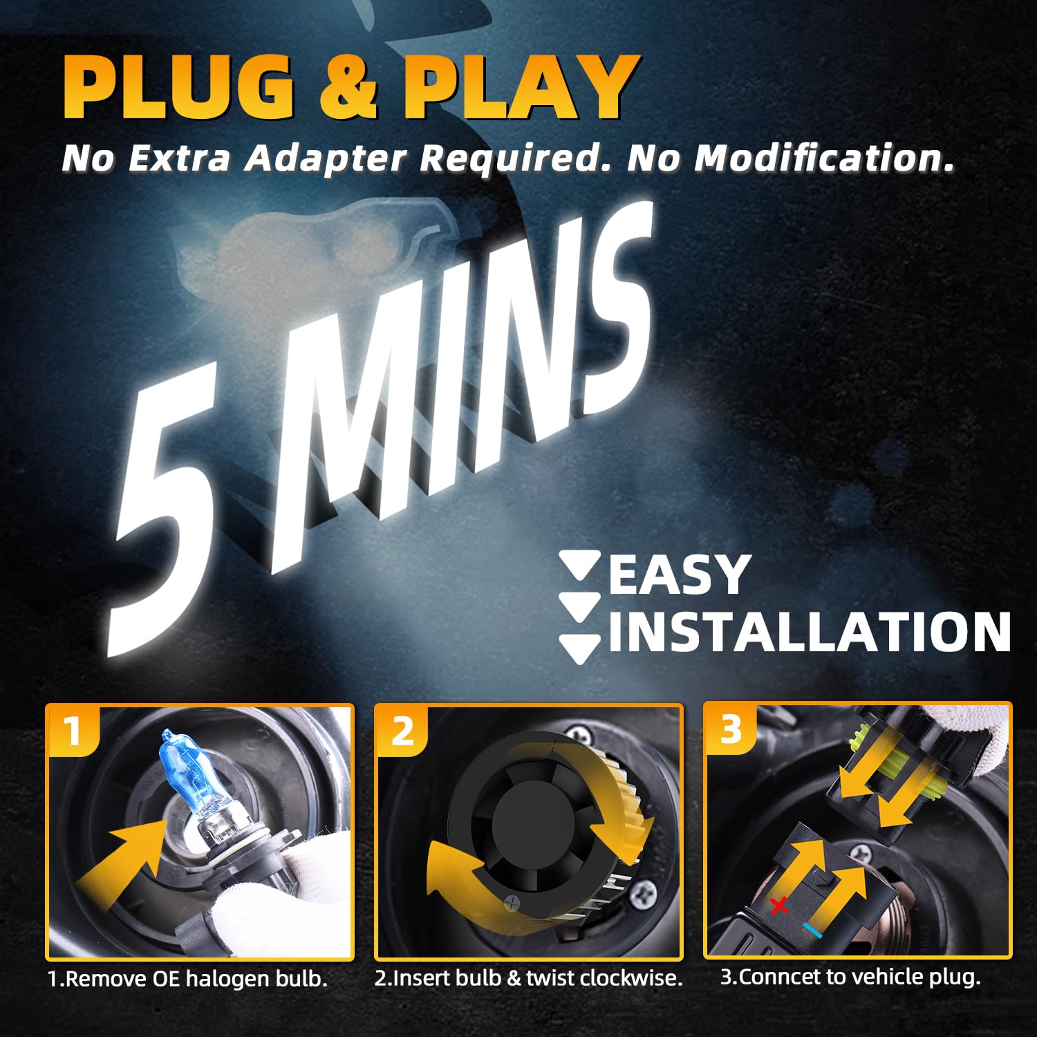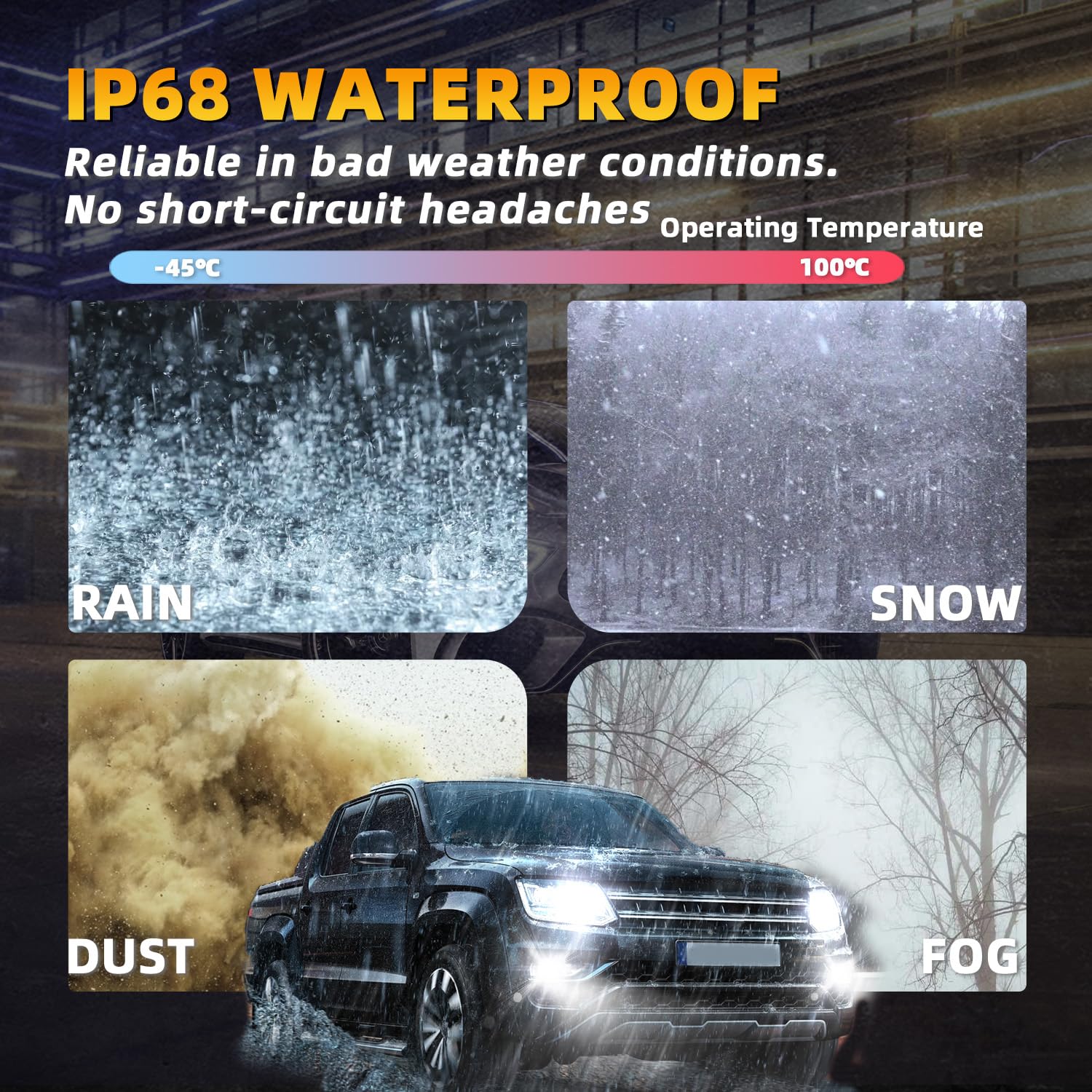 【Optimized Beam Pattern】Our upgraded dual-sided emitting chip lights up 360° for safer night driving. The wide beams make road signs and lines clear, and they won't blind oncoming cars. With its unique dual-side design, it offers enhanced illumination. Works great in rain, snow, fog, and haze.