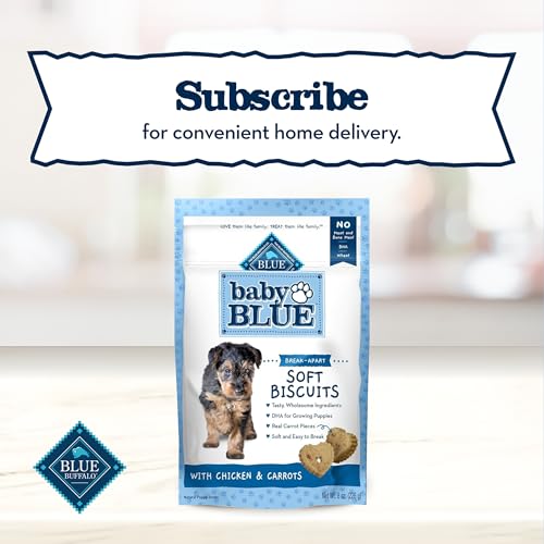 Reward your new puppy with the delicious taste of Baby BLUE Soft Biscuits. These natural dog treats are made with tasty, wholesome ingredients like real chicken, oats, and carrots for a taste dogs love. Blue Buffalo puppy treats are enhanced with DHA, a fatty acid found in mother's milk, to support brain development. They also help promote skin and coat health with Omega 3 & 6 fatty acids. Baby BLUE puppy treats are great for training or an anytime reward. And because they're soft baked, you can break them into smaller pieces for portion control.