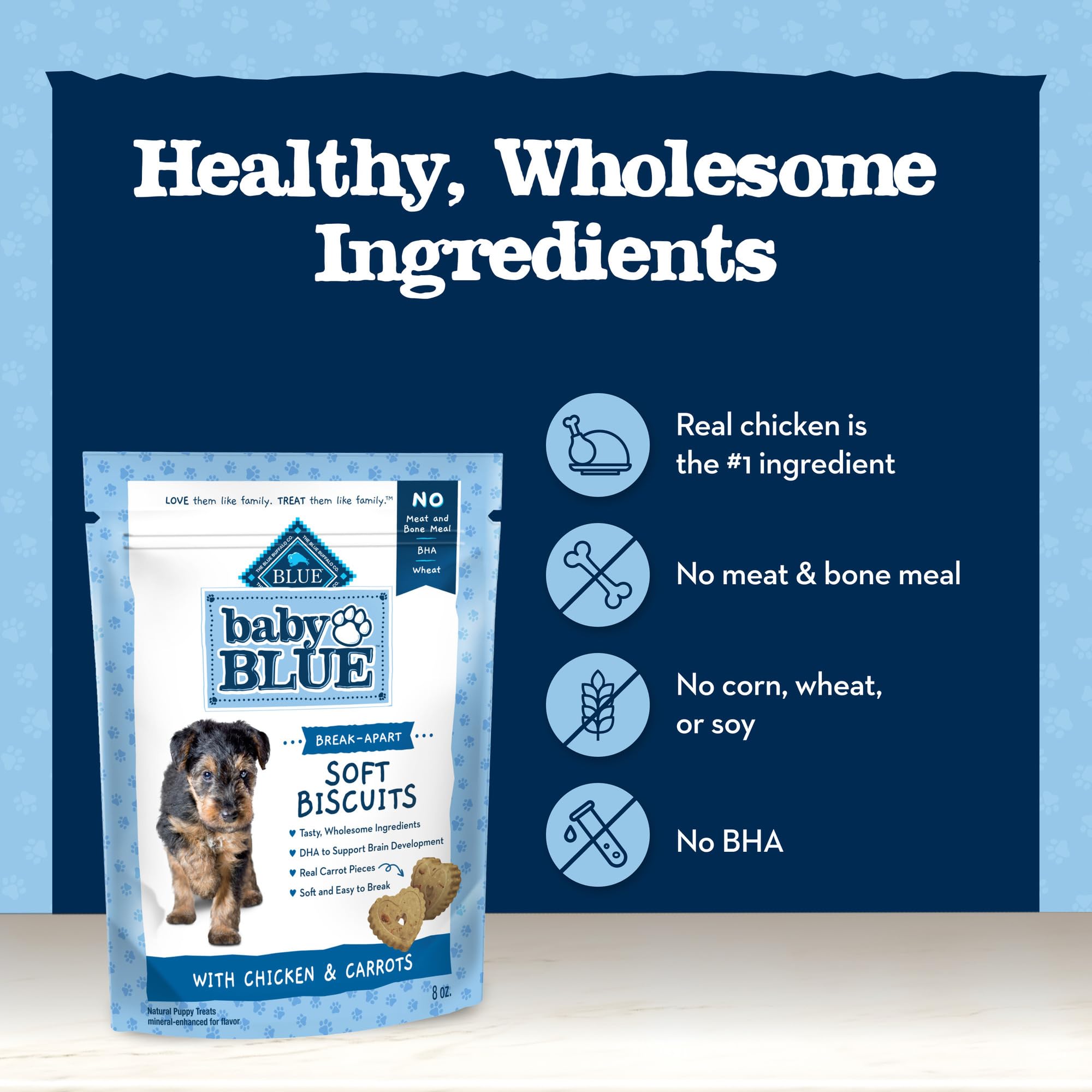 Contains: One (1) 8-oz bag of Baby BLUE Soft Biscuits Natural Puppy Treats, with Chicken & Carrots
